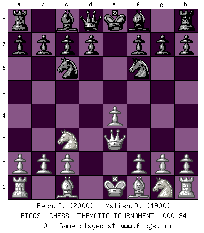 Last move : 1-0 2011 October 10 23:42:8 [Event "FICGS__CHESS__THEMATIC_TOURNAMENT__000134"] [Site "FICGS"] [Date "2011.07.28"] [Round "1"] [White "Pech,Jaroslav senior"] [Black "Malish,Dmitriy"] [Result "1-0"] [WhiteElo "2000"] [BlackElo "1900"] 1.e4 e5 2.d4 exd4 3.Qxd4 Nc6 4.Qe3 Nf6 5.Nc3 1-0 This chess game has been lost on time (started : 2011.07.28 1:15:58) Centre game : Berger variation Player White won this chess game. Follow this game move after move (download)The most important feature of the Chess position is the activity of the pieces. This is absolutely fundamental in all phases of the game: Opening, Middlegame and especially Endgame. The primary constraint on a piece's activity is the Pawn structure. (Michael Stean) Die Idee von Capablanca, Schach als Fach in den Schulen zu lehren, ist großartig. (Fidel Castro) Haz el enroque temprano y seguido. (Rob Sillars) Dans le domaine de la peinture, de la gravure et de la sculpture, dès la première décennie de notre siècle, les artistes abandonnent la représentation de la partie d'échecs pour se concentrer sur les pièces, sur les échiquiers et sur toutes les variations auxquelles les unes et les autres peuvent donner lieu. On passe en quelque sorte d'un thème social à un thème musical (au sens de la musica médiévale, c'est-à-dire d'une notion qui inclue le rythme, l'harmonie, la construction et la déconstruction, etc.). Graphiquement et picturalement, l'échiquier apparaît comme une structure ouverte, dynamique, d'une richesse infinie, autorisant toutes les combinatoires et débouchant sur des mouvements et des rythmes de nature exponentielle. (Michel Pastoureau) The question of whether computers can think is just like question of whether submarines can swim. (Edsger W. Dijkstra)