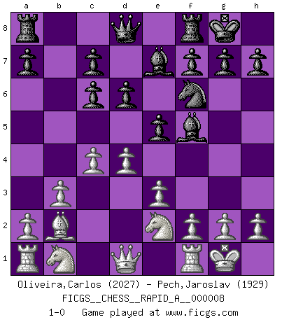 Last move : 1-0 2007 February 12 4:2:25 [Event "FICGS__CHESS__RAPID_A__000008"] [Site "FICGS"] [Date "2006.12.28"] [Round "1"] [White "Oliveira,Carlos"] [Black "Pech,Jaroslav"] [Result "1-0"] [WhiteElo "2027"] [BlackElo "1929"] 1.b3 e5 2.Bb2 Nc6 3.e3 Nf6 4.Bb5 d6 5.Bxc6+ bxc6 6.c4 Be7 7.Ne2 O-O 8.O-O Bf5 9.d4 1-0 This chess game has been lost on time (started : 2006.12.28 1:16:19) Nimzovich-Larsen attack : Modern variation Kingside Castling by player Black (move 7) Kingside Castling by player White (move 8) Player White won this chess game. Follow this game move after move (download)Chess is really ninety nine percent calculation. (Soltis) Kann Schach nicht schließlich das Nationalspiel der Deutschen werden? Und welche weiteren Ausblicke bieten sich dann dar! Welche Hebung des allgemeinen Kultur-Niveaus, ja der Moral, wenn das Schachbrett den Kartentisch verdrängen würde! Wahrlich, ein Ziel, des Schweißes der Edlen wert! (Siegbert Tarrasch) No es una movida, aún la mejor movida que tu debas buscar, sino un plan comprensible. (Eugene Znosko-Borovsky) Il s'avisa de me proposer d'apprendre les échecs qu'il jouait un peu... me voilà forcené des échecs. J'achète un échiquier, je m'enferme dans ma chambre, j'y passe des jours et des nuits à vouloir apprendre par cur toutes les parties. (Jean-Jacques Rousseau, Confessions) Watch your thoughts; they become words. Watch your words; they become actions. Watch your actions; they become habits. Watch your habits; they become character. Watch your character; it becomes your destiny. (Frank Outlaw)