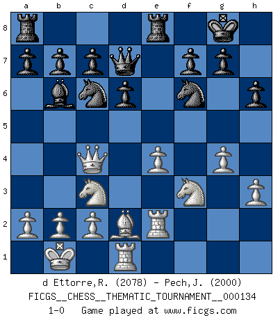 Last move : 1-0 2011 December 26 17:20:7 [Event "FICGS__CHESS__THEMATIC_TOURNAMENT__000134"] [Site "FICGS"] [Date "2011.07.28"] [Round "1"] [White "d Ettorre,Rodolfo"] [Black "Pech,Jaroslav senior"] [Result "1-0"] [WhiteElo "2078"] [BlackElo "2000"] 1.e4 e5 2.d4 exd4 3.Qxd4 Nc6 4.Qe3 Bb4+ 5.Bd2 Nf6 6.Nc3 O-O 7.O-O-O Re8 8.Bc4 d6 9.Nf3 h6 10.Rhe1 Bc5 11.Qe2 Be6 12.Kb1 Bxc4 13.Qxc4 Bxf2 14.Re2 Bb6 15.h3 Qd7 16.g4 1-0 This chess game has been lost on time (started : 2011.07.28 1:15:58) Centre game : Paulsen attack Kingside Castling by player Black (move 6) Queenside Castling by player White (move 7) Player White won this chess game. Follow this game move after move (download)Even the laziest King flees wildly in the face of a double check ! (Aaron Nimzowitsch) Ein unbeabsichtigtes Patt ist der Gipfel der Dummheit. (Anonymous) Cuando la partida de Ajedrez termina, el Peón y el Rey regresan a la misma caja. (Irish saying) Les Echecs ne sont pas pour les âmes timides. Ils requièrent un homme entier, qui ne s'arrête pas aveuglément à ce qui a été déjà établi, mais qui tente individuellement de sonder les profondeurs du jeu. (W. Steinitz) Games, world of games... There's always an opponent, and there's always a victim. (Revolver, movie)