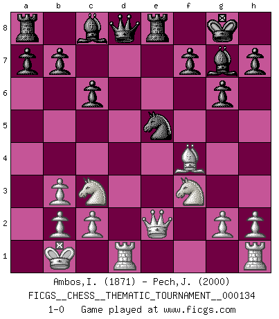 Last move : 1-0 2011 December 20 16:44:21 [Event "FICGS__CHESS__THEMATIC_TOURNAMENT__000134"] [Site "FICGS"] [Date "2011.07.28"] [Round "1"] [White "Ambos,Ilmar"] [Black "Pech,Jaroslav senior"] [Result "1-0"] [WhiteElo "1871"] [BlackElo "2000"] 1.e4 e5 2.d4 exd4 3.Qxd4 Nc6 4.Qe3 g6 5.Nc3 Bg7 6.Bc4 d6 7.Bd2 Nf6 8.O-O-O O-O 9.f3 Ne5 10.Bb3 c6 11.f4 Ned7 12.Nf3 Nc5 13.Kb1 Re8 14.e5 Nxb3 15.axb3 dxe5 16.fxe5 Ng4 17.Qe2 Nxe5 18.Bf4 1-0 This chess game has been lost on time (started : 2011.07.28 1:15:58) Centre game : Paulsen attack Queenside Castling by player White (move 8) Kingside Castling by player Black (move 8) Player White won this chess game. Follow this game move after move (download)Not all artists are Chess players, but all Chess players are artists. (Marcel Duchamp) Ich rechne überhaupt nicht voraus. Ich gewinne auch so. (Robert James Fischer) Te sientas frente a un tablero y repentinamente tu corazón brinca. Tu mano tiembla al tomar una pieza y moverla. Pero lo que el Ajedrez te enseña es que tu debes permanecer ahí con calma y pensar de que si realmente es una buena idea o de que si hay otras ideas mejores. (Stanley Kubrick) Roi des jeux et jeu des rois, les échecs portent en eux un sentiment d'infini. Ils donnent à celui qui s'est efforcé d'en approfondir les arcanes l'impression de n'être pas à la mesure de l'homme; en fait, ils constituent un résumé de l'univers, un microcosme, et figurent cette grande échelle qui, dans les plans de la lumière descend jusqu'à la matière, qui des abîmes insondables remonte jusqu'en l'infini de Dieu. (Pyrame) A good aphorism is too hard for the tooth of time, and is not worn away with the centuries, although it serves as food for every speech. (Friedrich Nietzsche)