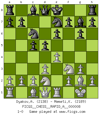 Last move : 1-0 2007 February 15 22:29:16 [Event "FICGS__CHESS__RAPID_A__000008"] [Site "FICGS"] [Date "2006.12.28"] [Round "1"] [White "Dyakov,Alexander"] [Black "Memeti,Kastriot"] [Result "1-0"] [WhiteElo "2138"] [BlackElo "2189"] 1.e4 e6 2.d3 d5 3.Nd2 c5 4.Ngf3 Nc6 5.g3 g6 6.Bg2 Bg7 7.O-O Nge7 8.Re1 1-0 This chess game has been lost on time (started : 2006.12.28 1:16:19) French : King's Indian attack Kingside Castling by player White (move 7) Player White won this chess game. Follow this game move after move (download)It is not enough to be a good player... you must also play well. (Siegbert Tarrasch) Es ist wirklich schade, dass so viele Schachspieler nicht auf ihr Äußeres achten! (Alexandra Kosteniuk) ¿Quién es tu oponente esta tarde? Esta tarde mi oponente son las piezas negras. (Akiba Rubinstein) Les échecs c'est le défi de l'alpiniste, toujours plus haut, prêt à tout pour monter à l'assaut du Roi ennemi. Les échecs, c'est de la musique en mouvement, un ballet majestueux pour les yeux. C'est de la poésie composée par les fantômes du passé qui au même titre que Rimbaud ou Verlaine méritent notre admiration. Les échecs, c'est de la peinture ou le moindre mouvement modifie le tableau pour en faire un Picasso ou un Van Gogh. Les échecs, c'est tout et rien, c'est la vie et la mort. Jjulie33 sur le forum de France-Echecs. To err is human, to shift the blame on someone else is tactical. (Mladen Jankovic)