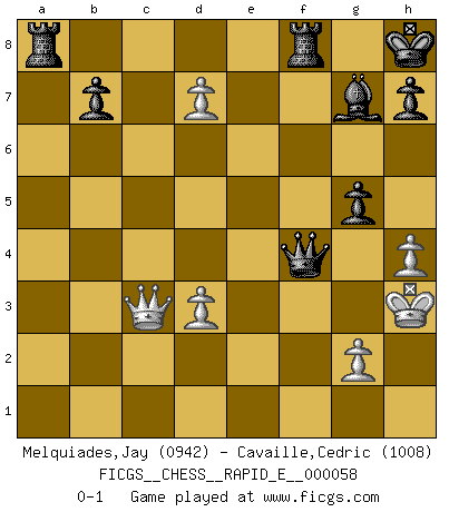 Last move : 0-1 2011 September 17 18:15:22 [Event "FICGS__CHESS__RAPID_E__000058"] [Site "FICGS"] [Date "2011.07.28"] [Round "1"] [White "Melquiades,Jay"] [Black "Cavaille,Cedric"] [Result "0-1"] [WhiteElo "0942"] [BlackElo "1008"] 1.e4 c5 2.c4 d6 3.h3 Nf6 4.f3 e6 5.Bd3 Be7 6.Nc3 O-O 7.Nge2 Nc6 8.f4 e5 9.Nd5 Nxd5 10.cxd5 Nb4 11.Bc4 a6 12.d3 a5 13.Nc3 Bh4+ 14.Kf1 exf4 15.Bxf4 Bg5 16.Qf3 Bxf4 17.Nb5 Bh6 18.a3 Nc2 19.Re1 Nxe1 20.Kxe1 Bd7 21.Nxd6 Qb6 22.Nf5 Bxf5 23.Kf2 Qxb2+ 24.Kg3 Bd7 25.d6 Qxa3 26.h4 a4 27.e5 Qb2 28.e6 Bxe6 29.Bxe6 fxe6 30.Qg4 a3 31.Qxe6+ Kh8 32.Qe7 a2 33.d7 a1Q 34.Rxa1 Qxa1 35.Kg4 Qf6 36.Qxc5 Qf4+ 37.Kh3 g5 38.Qc3+ Bg7 0-1 Sicilian defense Kingside Castling by player Black (move 6) Promotion Queen by player Black (move 33) Player Black won this chess game. Follow this game move after move (download)That's what Chess is all about. One day you give your opponent a lesson, the next day he gives you one. (Bobby Fischer) Karpov ist ein Museumsstück. (Garry Kasparov) Desconfianza es la característica mas necesaria de un jugador de Ajedrez. (Siegbert Tarrasch) Un journaliste : 'Vous préférez avoir une dame de plus sur l'échiquier ou au lit ?' Boris Spassky : 'Ca dépend de la position.' He who fights with monsters should be careful lest he thereby become a monster. (Friedrich Nietzsche, Beyond Good and Evil)