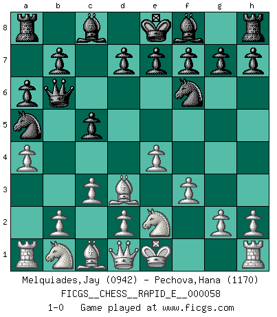 Last move : 1-0 2011 September 9 4:41:31 [Event "FICGS__CHESS__RAPID_E__000058"] [Site "FICGS"] [Date "2011.07.28"] [Round "1"] [White "Melquiades,Jay"] [Black "Pechova,Hana"] [Result "1-0"] [WhiteElo "0942"] [BlackElo "1170"] 1.e4 c5 2.c3 Nf6 3.f3 Nc6 4.Bb5 Qb6 5.a4 Na5 6.Ne2 a6 7.Bd3 1-0 Sicilian : Alapin's variation (2.c3) Player White won this chess game. Follow this game move after move (download)In Chess, just as in life, today's bliss may be tomorrow's poison. (Assaic) Wie gewinnt Tal? Er entwickelt alle seine Figuren in die Brettmitte und opfert sie dann irgendwo. (Robert James Fischer) No volvere nunca a jugar contigo. Has insultado a mi amigo. - cuando un oponente se maldijo por una mala jugada (Miguel Najdorf) Lorsque vous vous retrouvez devant une position atroce, ne tendez pas un ultime piège dérisoire avec l'intention d'abandonner si l'adversaire le déjoue ! Faites-vous plutôt un devoir de résister comme si votre vie en dépendait. Jouez le coup qui vous déplairait au centuple si vous étiez dans la peau de votre tortionnaire ! Convictions are more dangerous enemies of truth than lies. (Friedrich Nietzsche)