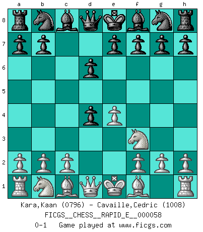 Last move : 0-1 2011 September 5 22:22:28 [Event "FICGS__CHESS__RAPID_E__000058"] [Site "FICGS"] [Date "2011.07.28"] [Round "1"] [White "Kara,Kaan"] [Black "Cavaille,Cedric"] [Result "0-1"] [WhiteElo "0796"] [BlackElo "1008"] 1.e4 c5 2.Nf3 d6 3.d4 cxd4 0-1 This chess game has been lost on time (started : 2011.07.28 11:45:44) Sicilian Player Black won this chess game. Follow this game move after move (download)No price is too great for the scalp of the enemy King. (Koblentz) Bogoljubow: Matt in vier Zügen! Tartakower: Ich verbitte mir jede Belästigung! (Savielly Grigorievitsch Tartakower) El Ajedrez se juega con la mente... ¡no con las manos!. (Renaud y Kahn) Je fais ceci parce que dans cinquante coups j'obtiendrai cela; je m'appelle Mikhail Moisevitch Botvinnik. (Botvinnik) The meaning of life is that it is to be lived, and it is not to be traded and conceptualized and squeezed into a pattern of systems. (Bruce Lee)