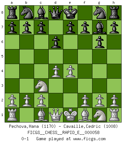 Last move : 0-1 2011 September 4 10:17:40 [Event "FICGS__CHESS__RAPID_E__000058"] [Site "FICGS"] [Date "2011.07.28"] [Round "1"] [White "Pechova,Hana"] [Black "Cavaille,Cedric"] [Result "0-1"] [WhiteElo "1170"] [BlackElo "1008"] 1.d4 g6 2.e4 Bg7 3.Nc3 d6 0-1 This chess game has been lost on time (started : 2011.07.28 11:45:44) Modern defense Player Black won this chess game. Follow this game move after move (download)By this measure (on the gap between Fischer & his contemporaries), I consider him the greatest world champion. (Garry Kasparov) Das Blackmar-Diemer-Gambit verändert den ganzen Menschen! (Emil Joseph Diemer) El Ajedrez es un juego terrible. Si no dominas el centro, tu oponente tiene una posición mas libre. Si tu tienes el centro, entonces realmente tienes algo de que preocuparte. (Siegbert Tarrasch) Toute estimation doit être constamment réévaluée. (Jacob Estrin) The modern world has divided itself into Conservatives and Progressives. The business of Progressives is to go on making mistakes. The business of the Conservatives is to prevent the mistakes from being corrected. (G.K. Chesterton)