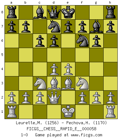 Last move : 1-0 2011 September 3 10:17:17 [Event "FICGS__CHESS__RAPID_E__000058"] [Site "FICGS"] [Date "2011.07.28"] [Round "1"] [White "Leurette,Marc-Antoine"] [Black "Pechova,Hana"] [Result "1-0"] [WhiteElo "1256"] [BlackElo "1170"] 1.e4 d6 2.d4 Nf6 3.Nc3 g6 4.Nf3 Bg7 5.Be3 c6 6.Bd3 Nbd7 7.Qd2 1-0 This chess game has been lost on time (started : 2011.07.28 11:45:44) Pirc : Classical (Two knights) system Player White won this chess game. Follow this game move after move (download)Fischer is under obligation to nobody. (Joseph Platz) Glücklicherweise sind Großmeister Ruben Fines reine Schachbücher weniger phallozentrisch [als seine Schachpsychologie] und deswegen auch weniger lächerlich. (Nigel Short) Coloca el contenido de las piezas del Ajedrez en un sombrero, agitalo vigorosamente, arrojalas en un tablero desde una altura de 30 centimetros y así obtendras el estilo de Steinitz. (H. E. Bird) Karpov est une pièce de musée. (Garry Kasparov) You lose, general Kenobi. (General Grievous in Star Wars ep.3)