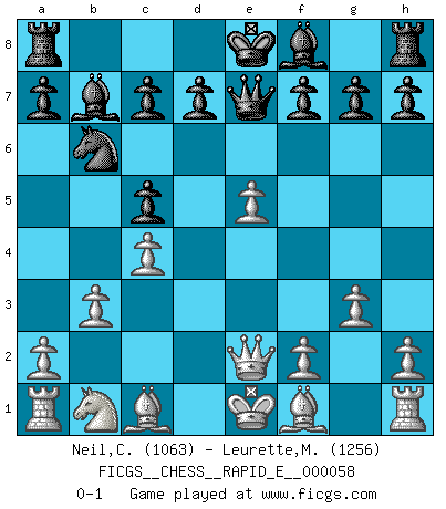 Last move : 0-1 2011 July 31 10:25:22 [Event "FICGS__CHESS__RAPID_E__000058"] [Site "FICGS"] [Date "2011.07.28"] [Round "1"] [White "Neil,Charlie"] [Black "Leurette,Marc-Antoine"] [Result "0-1"] [WhiteElo "1063"] [BlackElo "1256"] 1.e4 e5 2.Nf3 Nc6 3.d4 exd4 4.Nxd4 Nf6 5.Nxc6 bxc6 6.Qe2 Qe7 7.e5 Nd5 8.c4 Nb6 9.b3 c5 10.g3 Bb7 0-1 Scotch : Schmidt variation Player Black won this chess game. Follow this game move after move (download)In life, as in Chess, one's own Pawns block one's way. A man's very wealth, ease, leisure, children, books, which should help him to win, more often checkmate him. (Charles Buxton) Der Partner hat auch seine Existenzberechtigung. (Savielly Grigorievitsch Tartakower) El Peón aislado arroja penumbra sobre todo el tablero. (Aaron Nimzovich) Avec des compensations pour le matériel en plus... (Anonyme) All battles are fought by scared men who'd rather be someplace else. (John Wayne in the movie In harm's way)
