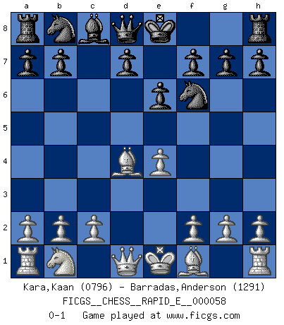Last move : 0-1 2011 September 4 22:19:9 [Event "FICGS__CHESS__RAPID_E__000058"] [Site "FICGS"] [Date "2011.07.28"] [Round "1"] [White "Kara,Kaan"] [Black "Barradas,Anderson"] [Result "0-1"] [WhiteElo "0796"] [BlackElo "1291"] 1.e4 c5 2.Nf3 e6 3.d4 cxd4 4.Nxd4 Bc5 5.Be3 Bxd4 6.Bxd4 Nf6 0-1 This chess game has been lost on time (started : 2011.07.28 11:45:44) Sicilian defense Player Black won this chess game. Follow this game move after move (download)What is the difference between chess and football? Everybody understands football, but nobody plays it. Everybody plays chess, but nobody understands it. Everything is relative. (Vladimir Kramnik) Ohne ihre Erfolge schmälern zu wollen würde ich sagen Petrosian, Spassky und Karpov verdanken ihre Siege ihren Trainern - Boleslavsky, Bondarevsky und Furman. (Mikhail Moiseyevich Botvinik) Peones: ellos son el alma de esta partida, solos forman el ataque y la defensa. (Philidor) Roi des jeux et jeu des rois, les échecs portent en eux un sentiment d'infini. Ils donnent à celui qui s'est efforcé d'en approfondir les arcanes l'impression de n'être pas à la mesure de l'homme; en fait, ils constituent un résumé de l'univers, un microcosme, et figurent cette grande échelle qui, dans les plans de la lumière descend jusqu'à la matière, qui des abîmes insondables remonte jusqu'en l'infini de Dieu. (Pyrame) There are three kinds of lies: lies, damned lies and statistics. (Mark Twain)
