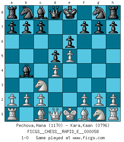 Last move : 1-0 2011 October 2 11:22:27 [Event "FICGS__CHESS__RAPID_E__000058"] [Site "FICGS"] [Date "2011.07.28"] [Round "1"] [White "Pechova,Hana"] [Black "Kara,Kaan"] [Result "1-0"] [WhiteElo "1170"] [BlackElo "0796"] 1.e4 e6 2.d4 d5 3.Nc3 Bb4 4.e5 1-0 This chess game has been lost on time (started : 2011.07.28 11:45:44) French : Winawer, Advance variation Player White won this chess game. Follow this game move after move (download)Chess holds its master in its own bonds, shackling the mind and brain so that the inner freedom of the very strongest must suffer. (Albert Einstein) Rubinstein ist ein Turmendspiel, welches die Götter vor tausenden von Jahren begannen. (Savielly Grigorievitsch Tartakower) No hay un Gran Maestro de Ajedrez que sea normal; solo se diferencían ellos por la magnitud de su locura. (Viktor Korchnoi) Le jeu d'échecs est comme rejeté hors du temps. (Antoine de Saint-Exupéry) Opportunities multiply as they are seized. (Sun Tzu)