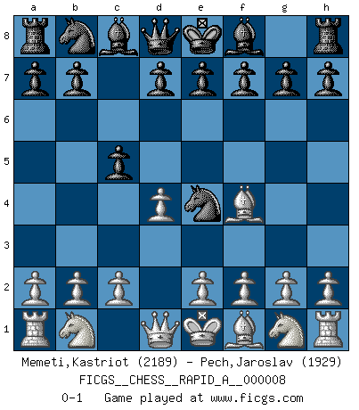 Last move : 0-1 2007 March 10 13:12:54 [Event "FICGS__CHESS__RAPID_A__000008"] [Site "FICGS"] [Date "2006.12.28"] [Round "1"] [White "Memeti,Kastriot"] [Black "Pech,Jaroslav"] [Result "0-1"] [WhiteElo "2189"] [BlackElo "1929"] 1.d4 Nf6 2.Bg5 Ne4 3.Bf4 c5 0-1 This chess game has been lost on time (started : 2006.12.28 1:16:19) Trompowsky attack (Ruth, Opovcensky Opening) Player Black won this chess game. Follow this game move after move (download)Examine moves that smite! A good eye for smites is far more important than a knowledge of strategical principles. (Purdy) Mein Gehirn das ist mein zweitwichtigstes Organ [Aus dem Film: Der Schläfer]. (Woody Allen) Si tu oponente no puede hacer nada activo, entonces no apures la posición; En vez de eso, dejalo estar sentado ahí, sufriendo y rogandote por un empate. (Jeremy Silman) Les échecs, c'est la lutte contre l'erreur. (Johannes Zukertort) Shallow men believe in luck. Strong men belive in cause and effect. (Ralph Waldo Emerson)