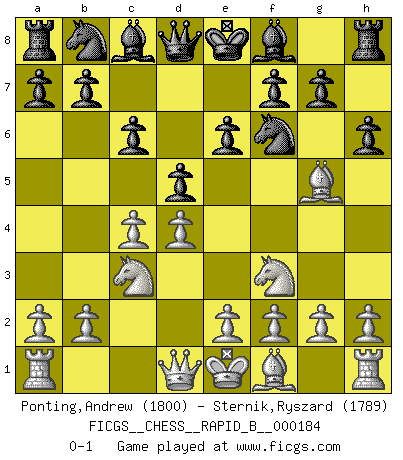Last move : 0-1 2011 August 20 16:18:34 [Event "FICGS__CHESS__RAPID_B__000184"] [Site "FICGS"] [Date "2011.07.28"] [Round "1"] [White "Ponting,Andrew"] [Black "Sternik,Ryszard"] [Result "0-1"] [WhiteElo "1800"] [BlackElo "1789"] 1.d4 d5 2.c4 c6 3.Nf3 Nf6 4.Nc3 e6 5.Bg5 h6 0-1 QGD Slav : 4.Nc3 Player Black won this chess game. Follow this game move after move (download)If you aren't afraid of Spassky, then I have removed the element of money. (Jim Slater) Wenn sie aufgeben, dann danke ich Ihnen für das Spiel (Eventualzug beim Fernschach). (Anonymous) El Ajedrez no es como la vida... ¡tiene reglas!. (Mark Pasternak) Les échecs sont plus proches de l'art de l'assassinat que de l'art de la guerre. (Arturo Perez-Reverte) Experiences are the keys to life. (Daniel Parmet)