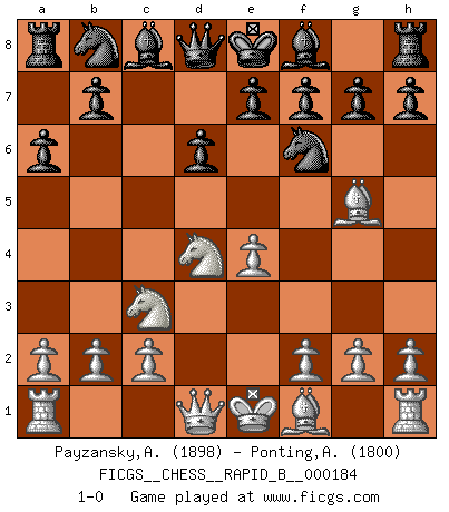 Last move : 1-0 2011 August 20 16:18:27 [Event "FICGS__CHESS__RAPID_B__000184"] [Site "FICGS"] [Date "2011.07.28"] [Round "1"] [White "Payzansky,Aleksey"] [Black "Ponting,Andrew"] [Result "1-0"] [WhiteElo "1898"] [BlackElo "1800"] 1.e4 c5 2.Nf3 d6 3.d4 cxd4 4.Nxd4 Nf6 5.Nc3 a6 6.Bg5 1-0 Sicilian : Najdorf, 6.Bg5 Player White won this chess game. Follow this game move after move (download)Pawns are born free, yet they are everywhere in chains. (Rick Kennedy) Das typische an einem Großmeister ist, daß er eine gewonnene Position schnell und schmerzlos gewinnt. (Irving Chernev) Yo nunca en mi vida he jugado la Defensa Francesa, que viene siendo la más aburrida de todas las Aperturas. (Wilhelm Steinitz) Les échecs, c'est l'imagination. (David Bronstein) To err is human, but to really foul things up requires a computer. (Farmer's Almanac, 1978)