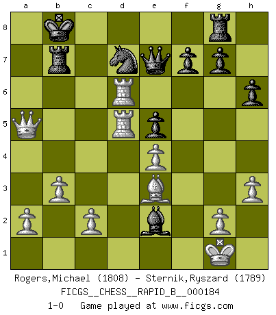 Last move : 1-0 2011 August 25 23:20:43 [Event "FICGS__CHESS__RAPID_B__000184"] [Site "FICGS"] [Date "2011.07.28"] [Round "1"] [White "Rogers,Michael"] [Black "Sternik,Ryszard"] [Result "1-0"] [WhiteElo "1808"] [BlackElo "1789"] 1.e4 e5 2.Nf3 Nc6 3.Bc4 Bc5 4.O-O Nf6 5.d4 Bxd4 6.Nxd4 Nxd4 7.f4 d6 8.fxe5 dxe5 9.Bg5 Qe7 10.Nd2 Bd7 11.Nb3 Ne6 12.Bxe6 Bxe6 13.Qd3 c6 14.Rad1 Rg8 15.h3 h6 16.Be3 Nd7 17.Qc3 a6 18.Na5 O-O-O 19.Nxc6 bxc6 20.Qxc6+ Kb8 21.Rd6 Rc8 22.Qxa6 Rc7 23.Rfd1 Rb7 24.Qa5 Bc4 25.b3 Be2 26.R1d5 1-0 Giuoco Piano Kingside Castling by player White (move 4) Queenside Castling by player Black (move 18) Player White won this chess game. Follow this game move after move (download)The battle for the ultimate truth will never be won. And that's why Chess is so fascinating. (Hans Kmoch) Es ist peinlich, dass ich nie Weltmeister wurde. Es wäre leicht, Leonid Breschnjew als Ursache vorzuschieben, dessen Apparat den Vorzeigekommunisten Anatoli Karpow in allem unterstützte. Aber Garri Kasparow zum Beispiel, der ebenfalls von den Sowjets unerwünscht war, hat trotz der Widerstände den WM-Titel erobert. (Viktor Kortschnoi) El Ajedrez es de 30 a 40 por ciento psicología. Uno no cuenta con esto cuando se juega contra una computadora. No lo puedo confundir. (Judith Polgar) La victoire dans une partie d'Echecs appartient la plupart du temps à celui qui voit un peu plus loin que l'adversaire. (Lasker) Real knowledge is to know the extent of one's ignorance. (Confucius)