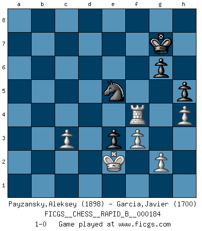 Last move : 1-0 2011 August 27 12:56:42 [Event "FICGS__CHESS__RAPID_B__000184"] [Site "FICGS"] [Date "2011.07.28"] [Round "1"] [White "Payzansky,Aleksey"] [Black "Garcia,Javier"] [Result "1-0"] [WhiteElo "1898"] [BlackElo "1700"] 1.e4 c5 2.Nf3 d6 3.d4 cxd4 4.Nxd4 Nf6 5.Nc3 e5 6.Bb5+ Bd7 7.Bxd7+ Nbxd7 8.Nf5 g6 9.Nxd6+ Bxd6 10.Qxd6 Rc8 11.Bg5 Rc6 12.Qb4 Rb6 13.Qa3 Ra6 14.Bxf6 Qxf6 15.Nd5 Rxa3 16.Nxf6+ Nxf6 17.bxa3 Nxe4 18.Rb1 b6 19.a4 O-O 20.a5 Nc3 21.Rb3 Nxa2 22.axb6 axb6 23.Rxb6 Nc3 24.Rc6 Ne4 25.f3 Ng5 26.Ke2 Kg7 27.Ra1 h5 28.Ra5 Re8 29.R6c5 f6 30.Rc7+ Kh6 31.c3 e4 32.Kf2 e3+ 33.Ke2 f5 34.Rc6 f4 35.R5a6 Rg8 36.h4 Nf7 37.Rf6 Rg7 38.Ra7 Ne5 39.Rxg7 Kxg7 40.Rxf4 1-0 Sicilian : Venice attack Kingside Castling by player Black (move 19) Player White won this chess game. Follow this game move after move (download)The hardest game to win is a won game. (Emanuel Lasker) Ja, ich habe einmal eine Blitzpartie gespielt, es war in einem Zug, 1929. --im Interview 1989 (Mikhail Moiseyevich Botvinik) Aún el Rey más flojo huye despavorido ante la amenaza de un Jaque doble. (Aaron Nimzowitsch) Vous m'avez demandé de vous exposer quel est le fondement de la prière. Je ne fais que préparer les pièces du jeu sur la table... Nous sera-t-il permis d'en adopter les règles et si nous les appliquons scrupuleusement nous ne tarderons pas à faire mat le Roi divin ! Il ne pourra échapper à nos mains. (Sainte Thérèse d'Avila, Chemin de perfection) May I never be complete. May I never be content. May I never be perfect. Deliver me, Tyler, from being perfect and complete. (Chuck Palahniuk, Fight Club)