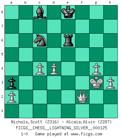 Last move : 1-0 2011 July 28 17:44:43 [Event "FICGS__CHESS__LIGHTNING_SILVER__000125"] [Site "FICGS"] [Date "2011.07.28"] [Round "1"] [White "Nichols,Scott"] [Black "Alcala,Alvin"] [Result "1-0"] [WhiteElo "2316"] [BlackElo "2287"] 1.e4 c5 2.Nf3 d6 3.h3 Nf6 4.c3 Nc6 5.Bd3 d5 6.e5 Nd7 7.Bb5 e6 8.O-O Qa5 9.Bxc6 bxc6 10.d3 Be7 11.c4 h6 12.b3 O-O 13.Qc2 f5 14.exf6 Bxf6 15.Bb2 e5 16.Nbd2 Qc7 17.Rfe1 a5 18.Rac1 Re8 19.Re2 a4 20.b4 a3 21.Ba1 d4 22.bxc5 Ba6 23.Nb3 Rf8 24.Rf1 Bb7 25.Nfd2 g5 26.Ne4 Bg7 27.Nd6 Bc8 28.Bxd4 exd4 29.Re7 Qd8 30.Qe2 Nxc5 31.Nf7 Qxe7 32.Qxe7 Nxb3 33.Nd6 Na5 34.g4 Bf6 35.Qe4 Bg7 36.f4 Rf6 37.Qe7 gxf4 38.Ne8 Rf7 39.Qd8 Bf8 40.Nf6+ Kh8 41.Nh5 Kg8 42.Qxd4 Ra6 43.Nf6+ Kh8 44.Qe5 c5 45.Nd7 Kg8 46.Nxf8 Rxf8 47.Rxf4 Rxf4 48.Qxf4 Nc6 49.Qxh6 Ne7 50.Qh5 Kf8 51.Qxc5 Rh6 52.Kg2 Re6 53.Qf2+ Ke8 54.Kg3 Nc6 55.d4 1-0 Sicilian Kingside Castling by player White (move 8) Kingside Castling by player Black (move 12) Player White won this chess game. Follow this game move after move (download)Modern Chess is too much concerned with things like Pawn structure. Forget it, Checkmate ends the game. (Nigel Short) Ein bischen Romantik kann weder im Schach noch in der Liebe schaden. Also versuche ich mich ab und zu daran zu erinnern. (Nigel Short) Antes de los Finales, los dioses han colocado el Juego Medio. (Siegbert Tarrasch) Donnez-moi un Cavalier en 6e et je gagnerais toutes mes parties. (Steinitz) Hold em is to stud what chess is to checkers. (Johnny Moss)