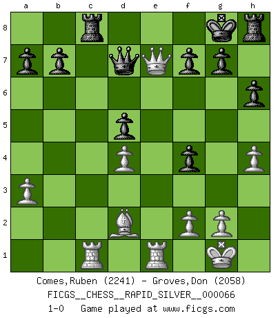 Last move : 1-0 2011 September 14 4:17:27 [Event "FICGS__CHESS__RAPID_SILVER__000066"] [Site "FICGS"] [Date "2011.07.28"] [Round "1"] [White "Comes,Ruben"] [Black "Groves,Don"] [Result "1-0"] [WhiteElo "2241"] [BlackElo "2058"] 1.e4 e6 2.c3 d5 3.e5 c5 4.d4 Nc6 5.Nf3 Qb6 6.a3 c4 7.Nbd2 Na5 8.Be2 Bd7 9.Rb1 Ne7 10.b3 cxb3 11.Nxb3 Rc8 12.Bd3 Ba4 13.Nxa5 Qxa5 14.Qe2 Qxc3+ 15.Bd2 Qc7 16.Rb4 Bc6 17.O-O Qd7 18.h4 Nf5 19.R4b1 h6 20.Bxf5 exf5 21.e6 Qxe6 22.Rfe1 Be7 23.Qd3 Qf6 24.Qe3 f4 25.Qe2 Kf8 26.Ne5 Kg8 27.Nxc6 Qxc6 28.Rbc1 Qd7 29.Qxe7 1-0 French defense Kingside Castling by player White (move 17) Player White won this chess game. Follow this game move after move (download)Up to this point White has been following well-known analysis. But now he makes a fatal error: he begins to use his own head. (Siegbert Tarrasch) Im Internet Chess Club betrug mein Rating vorübergehend 3350 ELO-Punkte. (Sergej Karjakin) El Ajedrez es una manera fabulosa para que los niños aprendan a autovalorarse y a autoestimarse. (Saudin Robovic) Même un GMI sait rarement calculer sur plus de cinq coups une attaque à sacrifices. (Rudolf Spielmann) For a mechanic, you seem to do an excessive amount of thinking. (C-3PO in Star Wars ep.2)