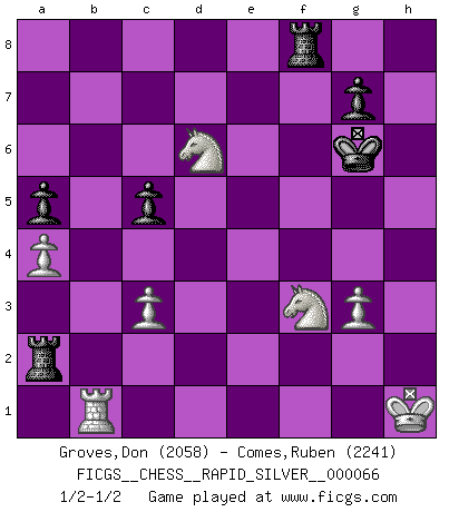 Last move : 1/2-1/2 2011 October 15 4:22:55 [Event "FICGS__CHESS__RAPID_SILVER__000066"] [Site "FICGS"] [Date "2011.07.28"] [Round "2"] [White "Groves,Don"] [Black "Comes,Ruben"] [Result "1/2-1/2"] [WhiteElo "2058"] [BlackElo "2241"] 1.e4 c5 2.Nf3 d6 3.d4 cxd4 4.Nxd4 Nf6 5.Nc3 a6 6.Be2 e5 7.Nb3 Be7 8.O-O O-O 9.Qd3 Be6 10.Be3 Qc8 11.Rac1 a5 12.Rfd1 Nbd7 13.a4 Ng4 14.Bd2 Nb6 15.Ra1 Nf6 16.Bg5 Nbd7 17.Qg3 Kh8 18.Be3 h6 19.h3 Qc7 20.Rac1 Nb6 21.Nd2 Rad8 22.Bb5 Nfd7 23.Kh1 Rc8 24.f4 exf4 25.Bxf4 Nf6 26.Be3 Nbd7 27.Be2 b6 28.Nb5 Qb8 29.b3 Ne5 30.Bd4 Nc6 31.Bb2 d5 32.Qxb8 Rxb8 33.exd5 Nxd5 34.Bf3 Bg5 35.Rb1 Ncb4 36.Nc4 Rbd8 37.Ba3 Rg8 38.c3 Na2 39.Bxd5 Bxd5 40.Ncd6 Be6 41.Rb2 Kh7 42.g3 Nc1 43.h4 Bxb3 44.Rxb3 Nxb3 45.hxg5 hxg5 46.Rb1 Nc5 47.Nxf7 Rd2 48.Nxg5+ Kg6 49.Nf3 Ra2 50.Bxc5 bxc5 51.Nd6 Rf8 1/2-1/2 Sicilian : Najdorf, Opovcensky variation Kingside Castling by player White (move 8) Kingside Castling by player Black (move 8) This chess game ended in a draw. Follow this game move after move (download)It's always better to sacrifice your opponent's men. (Savielly Tartakover) Man wirke der falschen Auffassung entgegen, als ob jeder Zug Unmittelbares zu leisten habe; auch Werte- und Ruhezüge haben ihre Existenzberechtigung. (Aaron Nimzowitsch) No puedes jugar al Ajedrez si eres de corazón noble. (Proverbio Francés) Psychologiquement, tu dois avoir confiance en toi même, mais cette confiance doit être basée sur des faits. (Robert Fischer) Kids, you tried your best and you failed miserably. The lesson is, never try. (Simpsons)