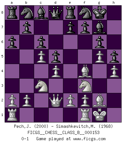 Last move : 0-1 2011 December 22 16:56:44 [Event "FICGS__CHESS__CLASS_B__000153"] [Site "FICGS"] [Date "2011.07.30"] [Round "1"] [White "Pech,Jaroslav senior"] [Black "Simashkevitch,Mykola"] [Result "0-1"] [WhiteElo "2000"] [BlackElo "1968"] 1.d4 d5 2.c4 c6 3.Nc3 Nf6 4.Nf3 a6 5.c5 Nbd7 6.Bf4 Nh5 7.Be3 g6 8.h3 Bg7 9.g4 Nhf6 10.Bg2 h5 11.g5 Nh7 12.h4 O-O 13.Bf4 Re8 14.O-O Nhf8 15.Qd2 Nb8 0-1 This chess game has been lost on time (started : 2011.07.30 14:42:57) QGD Slav defense Kingside Castling by player Black (move 12) Kingside Castling by player White (move 14) Player Black won this chess game. Follow this game move after move (download)Some sacrifices are sound; the rest are mine. (Mikhail Tal) Ein Kibitz ist einer, der deinem Gegner gute Ratschläge gibt. (Andrew Soltis) El Ajedrez era la lengua materna de Capablanca. (Reti) Mon pion favori sur ma case favorite ! Bronstein en parlant d'un coup de pion en h5 quand il avait les Noirs. The Internet is so big, so powerful and pointless that for some people it is a complete substitute for life. (Andrew Brown)