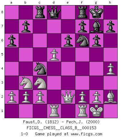 Last move : 1-0 2012 January 1 2:20:35 [Event "FICGS__CHESS__CLASS_B__000153"] [Site "FICGS"] [Date "2011.07.30"] [Round "1"] [White "Faust,Dieter"] [Black "Pech,Jaroslav senior"] [Result "1-0"] [WhiteElo "1812"] [BlackElo "2000"] 1.d4 Nf6 2.Nc3 d5 3.Nf3 g6 4.Bf4 Bg7 5.e3 O-O 6.h4 c5 7.dxc5 Nbd7 8.Be2 Nxc5 9.Be5 Bg4 10.O-O e6 11.Nd2 Bxe2 12.Qxe2 a6 13.Nb3 Ncd7 14.Bh2 Rc8 15.Rad1 Nb6 16.e4 Nc4 17.exd5 1-0 Queen's pawn game Kingside Castling by player Black (move 5) Kingside Castling by player White (move 10) Player White won this chess game. Follow this game move after move (download)Excellence at Chess is one mark of a scheming mind. (Sir Arthur Conan Doyle) Wenn Du nicht kämpfst, um anderen etwas zu beweisen, sondern nur für Dich selbst, dann bist du fast unbesiegbar. (Garry Kasparov) Cuando tengas duda... ¡juega al Ajedrez!. (Tevis) Tous ces prétendus hommes politiques sont les pions, les Cavaliers, les Tours ou les Fous d'une partie d'échecs qui se jouera tant qu'un hasard ne renversera pas l'échiquier. (Honoré de Balzac) The ego is not master in its own house. (Sigmund Freud)