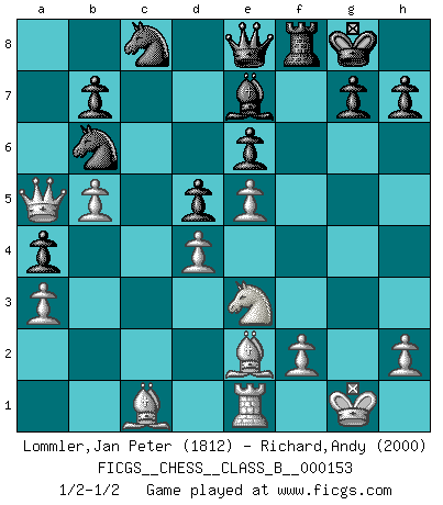 Last move : 1/2-1/2 2011 September 27 11:3:27 [Event "FICGS__CHESS__CLASS_B__000153"] [Site "FICGS"] [Date "2011.07.30"] [Round "1"] [White "Lommler,Jan Peter"] [Black "Richard,Andy"] [Result "1/2-1/2"] [WhiteElo "1812"] [BlackElo "2000"] 1.e4 c6 2.d4 d5 3.e5 Bf5 4.Nf3 e6 5.Be2 c5 6.c3 Nc6 7.O-O cxd4 8.cxd4 Nge7 9.a3 Nc8 10.Nbd2 Be7 11.b4 Nb6 12.Bb2 O-O 13.Rc1 Rc8 14.Re1 a5 15.b5 Na7 16.Nf1 Rxc1 17.Bxc1 a4 18.Ne3 Be4 19.Qd2 Bxf3 20.gxf3 f6 21.f4 fxe5 22.fxe5 Qe8 23.Qa5 Nac8 24.Qc3 Na7 25.Qa5 Nac8 1/2-1/2 Caro-Kann : Advance variation Kingside Castling by player White (move 7) Kingside Castling by player Black (move 12) This chess game ended in a draw. Follow this game move after move (download)What is the difference between chess and football? Everybody understands football, but nobody plays it. Everybody plays chess, but nobody understands it. Everything is relative. (Vladimir Kramnik) Wenn Capablanka heute auf der Schachbühne erscheinen würde, hätte er ein halbes Jahr gebraucht um sich die Schachtheorie anzueignen. Und dann hätte er alles und jeden besiegt. (Mikhail Moiseyevich Botvinik) El jugador táctico debe saber que hacer cuando algo se debe de hacer. El estratégico debe saber que hacer cuando nada se debe de hacer. (Savielly Tartakover) Une platitude souvent récitée à propos des Echecs est qu'une des choses les plus difficiles à réaliser est de gagner une position gagnante. Cela ne manque pas de sens mais, pour ma part, j'ai toujours trouvé plus difficile de gagner une position perdante. (Tim Krabbe) Is not life a hundred times too short to bore ourselves ? (Friedrich Nietzsche)