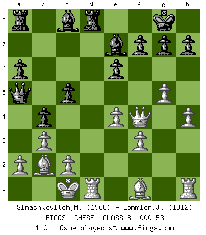 Last move : 1-0 2011 November 15 0:45:12 [Event "FICGS__CHESS__CLASS_B__000153"] [Site "FICGS"] [Date "2011.07.30"] [Round "1"] [White "Simashkevitch,Mykola"] [Black "Lommler,Jan Peter"] [Result "1-0"] [WhiteElo "1968"] [BlackElo "1812"] 1.e4 c5 2.Nf3 d6 3.d4 cxd4 4.Nxd4 Nf6 5.Nc3 a6 6.Be3 e6 7.f3 Be7 8.Qd2 Nc6 9.O-O-O O-O 10.g4 Nxd4 11.Bxd4 b5 12.g5 Nd7 13.h4 b4 14.Na4 Qa5 15.b3 Nc5 16.Nxc5 dxc5 17.Bb2 Rd8 18.Qf4 1-0 This chess game has been lost on time (started : 2011.07.30 14:42:57) Sicilian : Najdorf, Byrne (English) attack Queenside Castling by player White (move 9) Kingside Castling by player Black (move 9) Player White won this chess game. Follow this game move after move (download)Whoever sees no other aim in the game than that of giving checkmate to one's opponent will never become a good Chess player. (Euwe) Ich liebe den Moment, wenn ich das Ego meines Gegenüber breche. (Robert James Fischer) Un Peón pasado es un criminal, quién debe ser mantenido bajo candado y llave. Leves medidas, tales como vigilancia policiaca, no son suficientes. (Aaron Nimzovich) Il s'avisa de me proposer d'apprendre les échecs qu'il jouait un peu... me voilà forcené des échecs. J'achète un échiquier, je m'enferme dans ma chambre, j'y passe des jours et des nuits à vouloir apprendre par cur toutes les parties. (Jean-Jacques Rousseau, Confessions) In fact if nothing is done against this teddy bear, hereby I announce that I would quit chess, rapid chess, blitz chess, postal chess, email chess, server chess and correspondence chess I will then switch to a table game where teddy bears aren't going to be seen for a while, like Poker, or Roulette, all 18+ games. (Elmer Valderrama)
