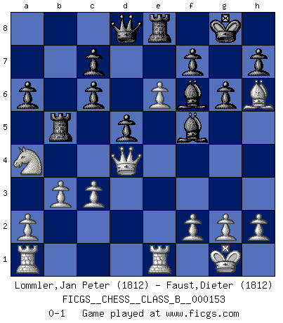 Last move : 0-1 2011 November 1 0:16:15 [Event "FICGS__CHESS__CLASS_B__000153"] [Site "FICGS"] [Date "2011.07.30"] [Round "1"] [White "Lommler,Jan Peter"] [Black "Faust,Dieter"] [Result "0-1"] [WhiteElo "1812"] [BlackElo "1812"] 1.e4 e5 2.Nf3 Nc6 3.Bb5 Nf6 4.O-O Nxe4 5.d4 Be7 6.Qe2 Nd6 7.Bxc6 bxc6 8.dxe5 Nf5 9.Qe4 g6 10.Nd4 Nxd4 11.Qxd4 O-O 12.Bh6 Re8 13.Nc3 d5 14.Na4 Rb8 15.b3 Bf5 16.c3 a6 17.Rfe1 Rb5 18.e6 Bf6 0-1 This chess game has been lost on time (started : 2011.07.30 14:42:57) Ruy Lopez : Open Berlin defense, 5...Be7 Kingside Castling by player White (move 4) Kingside Castling by player Black (move 11) Player Black won this chess game. Follow this game move after move (download)Avoid the crowd. Do your own thinking independently. Be the Chess player, not the Chess piece. (Ralph Charell) Modernes Schach erfordert enorme Anspannung. Es ist für einen normalen Menschen unmöglich das auszuhalten. (Viktor Kortschnoi) El Ajedrez es una hermosa aventura. (Bent Larsen) D'abord les bases : Jouez et étudiez, puis étudiez et jouez, ensuite jouez et étudiez, puis étudiez et jouez. Deuxièmement : Donnez toujours le meilleur de vous-même ! (Ken Smith) If we knew what we were doing, we would not call it research. (Albert Einstein)