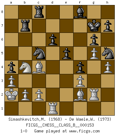 Last move : 1-0 2011 October 14 15:12:35 [Event "FICGS__CHESS__CLASS_B__000153"] [Site "FICGS"] [Date "2011.07.30"] [Round "1"] [White "Simashkevitch,Mykola"] [Black "De Waele,Willy"] [Result "1-0"] [WhiteElo "1968"] [BlackElo "1973"] 1.e4 c5 2.Nf3 d6 3.d4 cxd4 4.Nxd4 Nf6 5.Nc3 a6 6.Be3 e5 7.Nb3 Be6 8.f3 Be7 9.Qd2 O-O 10.O-O-O Nbd7 11.g4 b5 12.Rg1 b4 13.Nd5 Bxd5 14.exd5 a5 15.g5 Nh5 16.Kb1 Rb8 17.Nc1 g6 18.Nd3 Qc7 19.h4 Rfe8 20.Nf2 a4 21.Rg4 Qb7 22.Nd3 Qxd5 23.Nxb4 Qxd2 24.Bxd2 f5 25.Bc4+ Kf8 26.R4g1 Nc5 27.a3 Rec8 28.Bd5 Rc7 29.Be3 Rbc8 30.Rge1 Kg7 31.Ba2 Rb7 32.Bc4 Bf8 33.Rg1 Kh8 34.Rg2 Kg7 35.Ka2 f4 36.Bf2 1-0 Sicilian : Najdorf, Byrne (English) attack Kingside Castling by player Black (move 9) Queenside Castling by player White (move 10) Player White won this chess game. Follow this game move after move (download)Pawn endings are to Chess what putting is to golf. (Cecil Purdy) Über Frauen: Chess is better. (Robert James Fischer) El Rey es una pieza de pelea. ¡Usenlo!. (Wilhelm Steinitz) Un footballeur joue avec ses pieds, parfois avec sa tête. Un joueur d'échecs ne joue qu'avec sa tête. Et quand il ne joue plus, il meurt. (Jacob Murray) To be champion requires more than simply being a strong player; one has to be a strong human being as well. (Anatoly Karpov)