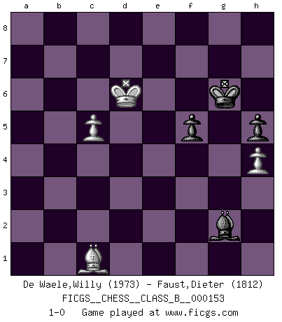 Last move : 1-0 2011 September 15 13:36:22 [Event "FICGS__CHESS__CLASS_B__000153"] [Site "FICGS"] [Date "2011.07.30"] [Round "1"] [White "De Waele,Willy"] [Black "Faust,Dieter"] [Result "1-0"] [WhiteElo "1973"] [BlackElo "1812"] 1.e4 e5 2.Nf3 Nc6 3.Bb5 Nf6 4.O-O Nxe4 5.d4 Be7 6.Qe2 Nd6 7.Bxc6 bxc6 8.dxe5 Nf5 9.Qe4 g6 10.Nd4 Nxd4 11.Qxd4 O-O 12.Bh6 Re8 13.Nc3 d5 14.exd6 Bf6 15.Qa4 cxd6 16.Qxc6 Bf5 17.Rae1 Be5 18.f4 Rc8 19.Qb5 Bxc3 20.bxc3 Bxc2 21.Bg5 Qb6+ 22.Qxb6 axb6 23.Rxe8+ Rxe8 24.Bf6 b5 25.g4 h5 26.gxh5 gxh5 27.Kf2 Kh7 28.Rg1 Ra8 29.Ke3 Rxa2 30.h4 Kh6 31.Rg5 Bd1 32.Rxb5 Bg4 33.Rb6 Re2+ 34.Kd4 Rd2+ 35.Ke4 Re2+ 36.Kd5 Re6 37.Rxd6 Rxd6+ 38.Kxd6 Be2 39.f5 Bd3 40.Ke5 Kh7 41.Kd4 Bxf5 42.c4 Kg6 43.Ke5 Bg4 44.c5 Bf3 45.Bg5 Bg2 46.Bc1 Bf3 47.Bb2 Bg2 48.Kd6 f5 49.Bc1 1-0 Ruy Lopez : Open Berlin defense, 5...Be7 Kingside Castling by player White (move 4) Kingside Castling by player Black (move 11) 10 pieces endgame at move 37 : White KBPPP , Black KRBPP WHITE : King + 1 Bishop 3 Pawns BLACK : King + 1 Rook 1 Bishop 2 Pawns 9 pieces endgame at move 38 : White KBPPP , Black KBPP WHITE : King + 1 Bishop 3 Pawns BLACK : King + 1 Bishop 2 Pawns 8 pieces endgame at move 41 : White KBPP , Black KBPP WHITE : King + 1 Bishop 2 Pawns BLACK : King + 1 Bishop 2 Pawns Player White won this chess game. Follow this game move after move (download)The older I grow, the more I value pawns. (Paul Keres) Die starken Figuren des Gegners muss man abtauschen. (José Raúl Capablanca) El Ajedrez lo es todo: arte, ciencia y deporte. (Anatoly Karpov) Botvinnik disait en comparant les échecs à la musique: Il existe une science dont le but est l'étude de l'acoustique et des sons. Mais il y a aussi un art qui se sert de l'océan des sons : c'est la musique. De toute évidence, il en est de même pour la pensée. La logique est l'étude des lois de la réflexion et les échecs reflètent, en tant qu'art, le côté logique de la réflexion, sous la forme d'images artistiques... Extrait de Fischer - Spassky, Reykjavik 1972 par Alexander & F. Wyndham (Ed. Solar), p 37. Beta. Software undergoes beta testing shortly before it's released. Beta is latin for still doesn't work. (Anonymous)