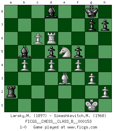 Last move : 1-0 2011 December 24 13:29:16 [Event "FICGS__CHESS__CLASS_B__000153"] [Site "FICGS"] [Date "2011.07.30"] [Round "1"] [White "Larsky,Mihail"] [Black "Simashkevitch,Mykola"] [Result "1-0"] [WhiteElo "1897"] [BlackElo "1968"] 1.e4 e5 2.Nf3 Nc6 3.Bb5 a6 4.Ba4 Nf6 5.O-O Be7 6.Re1 b5 7.Bb3 O-O 8.c3 d5 9.exd5 Nxd5 10.Nxe5 Nxe5 11.Rxe5 c6 12.d4 Bd6 13.Re1 Qh4 14.g3 Qh3 15.Be3 Bg4 16.Qd3 Rae8 17.Nd2 Re6 18.Qf1 Qh5 19.a4 bxa4 20.Rxa4 f5 21.f4 Rb8 22.Bxd5 cxd5 23.Rxa6 Qe8 24.Bf2 Qd7 25.Rxe6 Qxe6 26.b3 Rd8 27.c4 Qe8 28.Qd3 Be2 29.Qc3 Qf8 30.Ra4 Bc7 31.c5 Qe8 32.Qe3 Qxe3 33.Bxe3 Rc8 34.Kf2 Bb5 35.Ra7 Bc6 36.b4 Bd8 37.Nf3 Rc7 38.Ra6 Rc8 39.Ne5 Bb5 40.Rd6 Ra8 41.c6 Ra2+ 42.Kg1 1-0 Ruy Lopez : Closed, 7...O-O Kingside Castling by player White (move 5) Kingside Castling by player Black (move 7) Player White won this chess game. Follow this game move after move (download)If you aren't afraid of Spassky, then I have removed the element of money. (Jim Slater) Im Reiche der Wirklichkeit ist man nie so glücklich wie im Reiche der Gedanken. (Arthur Schopenhauer) Todo lo que importa ante el tablero de Ajedrez son buenas jugadas. (Bobby Fischer) Le jeu d'échecs fait naître et fortifie en nous plusieurs qualités précieuses dans le cours de l'existence, telles que la prévoyance, la circonspection, la prudence, et la persévérance. (Benjamin Franklin - 1783, la morale des échecs) Strategy without tactics is the slowest route to victory. Tactics without strategy is the noise before defeat. (Sun Tzu)