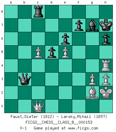 Last move : 0-1 2011 October 23 12:39:38 [Event "FICGS__CHESS__CLASS_B__000153"] [Site "FICGS"] [Date "2011.07.30"] [Round "1"] [White "Faust,Dieter"] [Black "Larsky,Mihail"] [Result "0-1"] [WhiteElo "1812"] [BlackElo "1897"] 1.d4 Nf6 2.Nc3 d5 3.Nf3 g6 4.g3 Bg7 5.Bg2 O-O 6.O-O c6 7.Bf4 Bf5 8.h3 Nbd7 9.a4 Ne4 10.a5 Nxc3 11.bxc3 b5 12.axb6 axb6 13.Nh4 Rxa1 14.Qxa1 Bxc2 15.Qa2 Be4 16.f3 Bf5 17.Nxf5 gxf5 18.e4 fxe4 19.fxe4 Nf6 20.e5 Nh5 21.Qe2 Nxf4 22.Rxf4 b5 23.Qd3 e6 24.Rh4 h6 25.Kh2 Qe7 26.Rg4 b4 27.cxb4 Qxb4 28.Qe3 Kh7 29.Qc1 c5 30.dxc5 Qb3 31.Rh4 Rc8 0-1 Queen's pawn game Kingside Castling by player Black (move 5) Kingside Castling by player White (move 6) Player Black won this chess game. Follow this game move after move (download)After black's reply to 1.e4 with 1..e5, leaves him always trying to get into the game. (Howard Staunton) Vom Schach wurde gesagt das Leben sei dafür nicht lange genug. Aber das ist der Fehler des Lebens, nicht des Schach'. (Irving Chernev) Aquellos que dicen que entienden al Ajedrez, no entienden nada. (Robert Hubner) J'ai vu le vaincu d'Echecs jouer des années durant dans l'espoir de la fête de la victoire. Car tu es plus riche de ce qu'elle existe si même elle n'est point pour toi. Ainsi de la perle du fond des mers. (Antoine de Saint-Exupéry) Don't anthropomorphize computers - they hate it. (Anonymous)