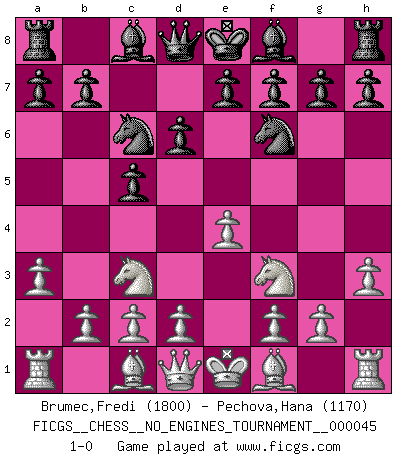 Last move : 1-0 2011 September 12 10:12:32 [Event "FICGS__CHESS__NO_ENGINES_TOURNAMENT__000045"] [Site "FICGS"] [Date "2011.07.31"] [Round "1"] [White "Brumec,Fredi"] [Black "Pechova,Hana"] [Result "1-0"] [WhiteElo "1800"] [BlackElo "1170"] 1.e4 d6 2.h3 c5 3.Nf3 Nf6 4.Nc3 Nc6 5.a3 1-0 This chess game has been lost on time (started : 2011.07.31 16:38:10) King's pawn Opening Player White won this chess game. Follow this game move after move (download)The isolated Pawn casts gloom over the entire chessboard. (Aaron Nimzovich) Der Verteidiger gebe der Gewalt nach, aber nur der Gewalt. Er schaffe sich nicht freiwillig, etwa aus Blindheit oder aus Schrecken, irgendwelche Schwächen. Er lasse sich nicht bluffen. (Emanuel Lasker) El ganar no lo es todo... pero el perder es nada. (Mednis) Horreur, mais aussi harmonie suprême : qu'y avait-il en effet au monde en dehors des échecs ? Le brouillard, l'inconnu, le non-être... (Vladimir Nabokov) Fame, I have already. Now I need the money. (an elderly Steinitz)