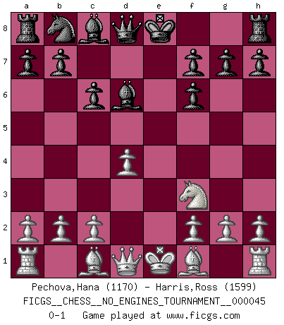 Last move : 0-1 2011 September 10 10:20:5 [Event "FICGS__CHESS__NO_ENGINES_TOURNAMENT__000045"] [Site "FICGS"] [Date "2011.07.31"] [Round "1"] [White "Pechova,Hana"] [Black "Harris,Ross"] [Result "0-1"] [WhiteElo "1170"] [BlackElo "1599"] 1.e4 c6 2.d4 d5 3.Nc3 dxe4 4.Nxe4 Nf6 5.Nxf6+ exf6 6.Nf3 Bd6 0-1 This chess game has been lost on time (started : 2011.07.31 16:38:10) Caro-Kann : Tartakower (Nimzovich) variation Player Black won this chess game. Follow this game move after move (download)Those who say they understand Chess, understand nothing. (Robert Hubner) Ich habe Kasparov in Rente geschickt. (Veselin Topalov) Botvinnik trató de alejar el misterio referente al Ajedrez, siempre relacionandolo a situaciones de la vida diaria. Solía llamar al Ajedrez un problema inexacto típico, similar a aquellos en que la gente tiene siempre que resolver a cada día. (Garry Kasparov) Une platitude souvent récitée à propos des Echecs est qu'une des choses les plus difficiles à réaliser est de gagner une position gagnante. Cela ne manque pas de sens mais, pour ma part, j'ai toujours trouvé plus difficile de gagner une position perdante. (Tim Krabbe) Always two there are. No more no less. A master, and an apprentice. (Master Yoda in Star Wars ep.1)
