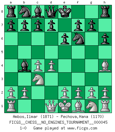 Last move : 1-0 2011 September 12 10:12:41 [Event "FICGS__CHESS__NO_ENGINES_TOURNAMENT__000045"] [Site "FICGS"] [Date "2011.07.31"] [Round "1"] [White "Ambos,Ilmar"] [Black "Pechova,Hana"] [Result "1-0"] [WhiteElo "1871"] [BlackElo "1170"] 1.d4 Nf6 2.c4 e6 3.Nc3 Bb4 4.Bg5 h6 5.Bh4 1-0 This chess game has been lost on time (started : 2011.07.31 16:38:10) Nimzo-Indian : Leningrad variation Player White won this chess game. Follow this game move after move (download)Mistrust is the most necessary characteristic of the Chess player. (Siegbert Tarrasch) Die Arbeit ist etwas Unnatürliches. Die Faulheit allein ist göttlich. (Anatole France) Los Peones son nacidos libres, y aún así, se encuentran por doquier encadenados. (Rick Kennedy) Dieu déplace le joueur, et celui-ci la pièce. Quel Dieu derrière Dieu commence donc la trame ? Arturo Perez-Reverte (prix de littérature policière 1993). Only sick music makes money today. (Friedrich Nietzsche)