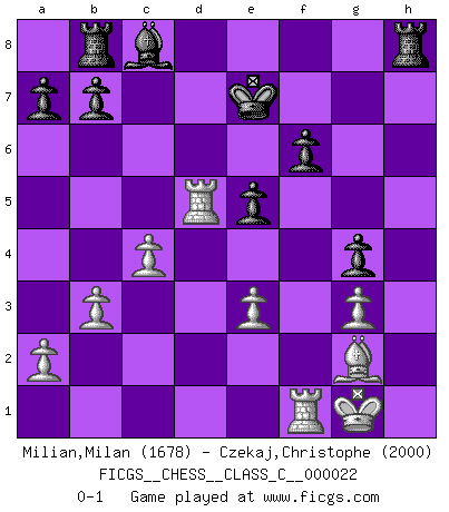 Last move : 0-1 2007 May 25 17:4:56 [Event "FICGS__CHESS__CLASS_C__000022"] [Site "FICGS"] [Date "2006.12.29"] [Round "1"] [White "Milian,Milan"] [Black "Czekaj,Christophe"] [Result "0-1"] [WhiteElo "1678"] [BlackElo "2000"] 1.c4 e5 2.Nc3 Nf6 3.g3 d5 4.cxd5 Nxd5 5.Bg2 Nb6 6.d3 Be7 7.Nf3 Nc6 8.O-O g5 9.Be3 g4 10.Nd2 h5 11.Nc4 Nxc4 12.dxc4 Nd4 13.Nd5 c5 14.Bxd4 cxd4 15.e3 dxe3 16.fxe3 h4 17.Nxe7 Qxd1 18.Raxd1 Kxe7 19.b3 hxg3 20.hxg3 Rb8 21.Rd5 f6 0-1 English : Bremen, reverse Dragon Kingside Castling by player White (move 8) Player Black won this chess game. Follow this game move after move (download)Chess is war over the board. The object is to crush the opponents mind. (Bobby Fischer) Pläne sind die Träume des Verständigen. (Ernst Freiherr von Feuchtersleben) Yo tuve un dolor de muelas en la primer partida. En el segundo juego, tuve un dolor de cabeza. En el tercero, tuve un ataque de reumatísmo. En la cuarta partida, no me sentía muy bien. ¿Y en el quinto juego? Bueno, ¿que acaso uno tiene que ganar todos los juegos?. (Siegbert Tarrasch) Il vaut mieux sacrifier les pièces de l'adversaire. (Xavier Tartacover) The obstacle is the path. (Zen proverb)