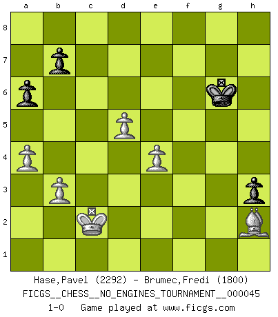 Last move : 1-0 2011 August 14 23:31:44 [Event "FICGS__CHESS__NO_ENGINES_TOURNAMENT__000045"] [Site "FICGS"] [Date "2011.07.31"] [Round "1"] [White "Hase,Pavel"] [Black "Brumec,Fredi"] [Result "1-0"] [WhiteElo "2292"] [BlackElo "1800"] 1.b3 d6 2.Bb2 e5 3.e3 Nf6 4.Nf3 Bg4 5.h3 Bh5 6.g4 Bg6 7.Bg2 c6 8.d3 h6 9.Nbd2 Nh7 10.Qe2 Be7 11.O-O-O Nd7 12.Nh2 O-O 13.f4 f5 14.gxf5 Bxf5 15.e4 Bg6 16.fxe5 dxe5 17.Ndf3 Bh5 18.Ng4 Ng5 19.Nfxe5 Nxe5 20.Bxe5 Ba3+ 21.Kb1 Bxg4 22.Qxg4 Bd6 23.Bb2 Rf4 24.Qe2 Qe7 25.h4 Ne6 26.Bh3 Raf8 27.Rdg1 R8f7 28.Bf5 c5 29.c3 Nc7 30.Qg2 Be5 31.h5 Qf6 32.Bc1 Rh4 33.Bg6 Re7 34.Rf1 Bf4 35.Rxh4 Qxh4 36.Rxf4 Qe1 37.Qf1 Qxf1 38.Rxf1 Nb5 39.Kc2 Nd6 40.Bf4 Nf7 41.Bb8 a6 42.Bxf7+ Rxf7 43.Rxf7 Kxf7 44.Be5 g5 45.hxg6+ Kxg6 46.d4 cxd4 47.cxd4 h5 48.d5 h4 49.a4 h3 50.Bh2 1-0 Nimzovich-Larsen attack Queenside Castling by player White (move 11) Kingside Castling by player Black (move 12) 10 pieces endgame at move 47 : White KBPPPP , Black KPPP WHITE : King + 1 Bishop 4 Pawns BLACK : King + 3 Pawns Player White won this chess game. Follow this game move after move (download)In Chess, at least, the brave inherit the earth. (Edmar Mednis) Man gibt nur Pakete auf. (Paul Keres) Aquellos que dicen entender al Ajedrez, no entienden nada. (Robert Hubner) Les Echecs, c'est l'art de la guerre sans les charniers, c'est la résurrection des morts tombés au champ d'honneur, l'espoir perpétuel, la suprématie de l'intelligence sur la force, la culture de l'esprit. (F. Szpiner) True nature is revealed in times of difficulty. (Chinese proverb)