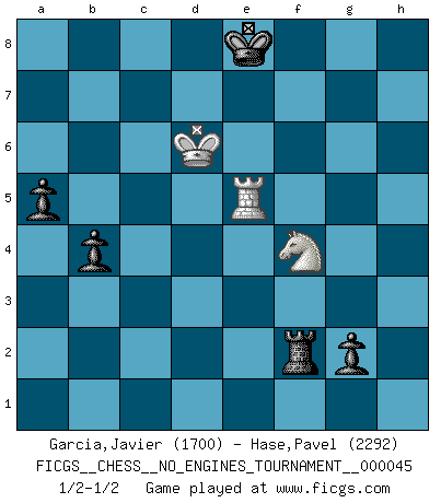 Last move : 1/2-1/2 2011 September 12 17:47:25 [Event "FICGS__CHESS__NO_ENGINES_TOURNAMENT__000045"] [Site "FICGS"] [Date "2011.07.31"] [Round "1"] [White "Garcia,Javier"] [Black "Hase,Pavel"] [Result "1/2-1/2"] [WhiteElo "1700"] [BlackElo "2292"] 1.e4 c5 2.Nf3 d6 3.d4 cxd4 4.Nxd4 Nf6 5.Nc3 a6 6.Bg5 e6 7.Bd3 Be7 8.O-O O-O 9.Bxf6 Bxf6 10.Nf3 Nd7 11.Re1 Qc7 12.Nd2 Rd8 13.Qh5 g6 14.Qh3 Ne5 15.Rad1 b5 16.f4 Nxd3 17.Qxd3 Bb7 18.Kh1 Rac8 19.g4 Bxc3 20.bxc3 Qxc3 21.Qxc3 Rxc3 22.Rc1 f5 23.gxf5 exf5 24.Kg1 fxe4 25.Nxe4 Rf3 26.Nf6+ Kf7 27.Nxh7 Rxf4 28.Ng5+ Kf6 29.Nh3 Rg4+ 30.Kf2 Rg2+ 31.Ke3 Re8+ 32.Kd4 Rxe1 33.Rxe1 Rxh2 34.Rf1+ Kg7 35.Nf4 Rxc2 36.Ne6+ Kg8 37.Rf8+ Kh7 38.Rf7+ Kh6 39.Rxb7 Rxa2 40.Ra7 g5 41.Kd5 g4 42.Rg7 Rd2+ 43.Kc6 b4 44.Rb7 a5 45.Rb5 g3 46.Nf4 Rf2 47.Rh5+ Kg7 48.Rg5+ Kf7 49.Rf5+ Ke8 50.Kxd6 g2 51.Re5+ Kf8 52.Rf5+ Ke8 53.Re5+ Kf8 54.Rf5+ Ke8 55.Re5+ 1/2-1/2 Sicilian : Najdorf, 6...e6 Kingside Castling by player White (move 8) Kingside Castling by player Black (move 8) 10 pieces endgame at move 39 : White KRNP , Black KRPPPP WHITE : King + 1 Rook 1 Knight 1 Pawn BLACK : King + 1 Rook 4 Pawns 9 pieces endgame at move 39 : White KRN , Black KRPPPP WHITE : King + 1 Rook 1 Knight BLACK : King + 1 Rook 4 Pawns 8 pieces endgame at move 50 : White KRN , Black KRPPP WHITE : King + 1 Rook 1 Knight BLACK : King + 1 Rook 3 Pawns This chess game ended in a draw. Follow this game move after move (download)Could we look into the head of a Chess player, we should see there a whole world of feelings, images, ideas, emotion and passion. (Alfred Binet) Intelligenz läßt sich nicht am Weg, sondern nur am Ergebnis feststellen. (Garry Kasparov) Las piezas de Ajedrez son los bloques del alfabeto que moldean los pensamientos; y esos pensamientos, aunque hagan un diseño visual en el tablero, expresan abstractamente su belleza como un poema. (Marcel Duchamp) Un millionnaire : 'Monsieur Steinitz ! Vous ne participez aux tournois que pour l'argent, alors que moi je n'y viens que pour l'honneur.' Steinitz : 'Chacun joue pour ce qu'il n'a pas'... Perfection is achieved, not when there is nothing more to add, but when there is nothing left to take away. (Antoine de Saint-Exupéry)