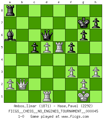 Last move : 1-0 2011 August 21 10:5:40 [Event "FICGS__CHESS__NO_ENGINES_TOURNAMENT__000045"] [Site "FICGS"] [Date "2011.07.31"] [Round "1"] [White "Ambos,Ilmar"] [Black "Hase,Pavel"] [Result "1-0"] [WhiteElo "1871"] [BlackElo "2292"] 1.d4 Nf6 2.c4 c5 3.d5 b5 4.cxb5 e6 5.Nc3 a6 6.b6 Qxb6 7.e4 Bb7 8.Nf3 exd5 9.exd5 Be7 10.Bc4 O-O 11.O-O d6 12.Re1 Re8 13.b3 Nbd7 14.Bb2 Ng4 15.h3 Nge5 16.Nxe5 Nxe5 17.Na4 Qc7 18.Bxe5 dxe5 19.Qh5 Bd6 20.Nc3 g6 21.Qh4 Kg7 22.Ne4 Qd8 23.Qg3 f5 24.Nxd6 Qxd6 25.f3 a5 26.Rad1 a4 27.bxa4 Rxa4 28.Bb5 R4a8 29.Bxe8 Rxe8 30.Qf2 Ra8 31.Qb2 Ba6 32.Rxe5 1-0 Benko gambit Kingside Castling by player Black (move 10) Kingside Castling by player White (move 11) Player White won this chess game. Follow this game move after move (download)Combinations have always been the most intriguing aspect of Chess. The masters look for them, the public applauds them, the critics praise them. It is because combinations are possible that Chess is more than a lifeless mathematical exercise. They are the poetry of the game; they are to Chess what melody is to music. They represent the triumph of mind over matter. (Reuben Fine) Dein Körper muss in Topform sein. Dein Schach verfällt, wenn dein Körper verfällt. Der Körper kann nicht vom Geist getrennt werden. (Robert James Fischer) Botvinnik trató de alejar el misterio referente al Ajedrez, siempre relacionandolo a situaciones de la vida diaria. Solía llamar al Ajedrez un problema inexacto típico, similar a aquellos en que la gente tiene siempre que resolver a cada día. (Garry Kasparov) Soyez une menace à chaque fois que vous vous asseyez pour jouer. (Ken Smith) See no evil, hear no evil, speak no evil. (The 3 monkeys)