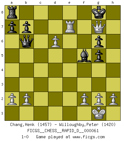 Last move : 1-0 2011 September 5 21:51:14 [Event "FICGS__CHESS__RAPID_D__000061"] [Site "FICGS"] [Date "2011.08.02"] [Round "1"] [White "Chang,Henk"] [Black "Willoughby,Peter"] [Result "1-0"] [WhiteElo "1457"] [BlackElo "1420"] 1.e4 g6 2.d4 Bg7 3.Nc3 c5 4.Nf3 cxd4 5.Nxd4 Nc6 6.Be3 e6 7.Bc4 Nge7 8.Qd2 O-O 9.O-O Ne5 10.Bb3 d5 11.exd5 Nxd5 12.Nxd5 exd5 13.Bh6 Nc6 14.Bxg7 Kxg7 15.Nf3 Be6 16.Rfe1 Ne7 17.Ng5 Qb6 18.c4 Rfe8 19.cxd5 Bf5 20.d6 Ng8 21.Bxf7 Rxe1+ 22.Rxe1 h6 23.Bxg8 hxg5 24.Re7+ Kxg8 25.Qd5+ Kh8 26.Qe5+ Kg8 27.Qg7+ 1-0 Robatsch defense Kingside Castling by player Black (move 8) Kingside Castling by player White (move 9) Player White won this chess game. Follow this game move after move (download)That's what Chess is all about. One day you give your opponent a lesson, the next day he gives you one. (Bobby Fischer) Die Partien sind immer verschieden, die Interviews immer die gleichen. (Garry Kasparov) El hombre es un frívolo, una creatura engañosa y como un jugador de Ajedrez, se preocupa mas por el proceso de obtener su meta que de la meta por sí misma. (Dostoyevsky) Mon pion favori sur ma case favorite ! Bronstein en parlant d'un coup de pion en h5 quand il avait les Noirs. God, you are such an idiot. - Actually, I thought I was more of a jerk. (Gregory House to Stacy Warner, House M.D.)