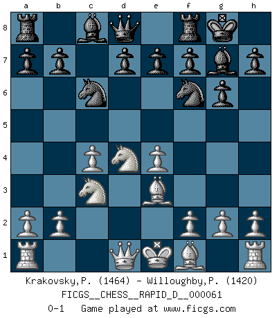 Last move : 0-1 2011 August 12 8:22:12 [Event "FICGS__CHESS__RAPID_D__000061"] [Site "FICGS"] [Date "2011.08.02"] [Round "1"] [White "Krakovsky,Peter"] [Black "Willoughby,Peter"] [Result "0-1"] [WhiteElo "1464"] [BlackElo "1420"] 1.e4 g6 2.d4 Bg7 3.Nf3 c5 4.c4 cxd4 5.Nxd4 Nc6 6.Be3 Nf6 7.Nc3 O-O 0-1 Robatsch (Modern) defense Kingside Castling by player Black (move 7) Player Black won this chess game. Follow this game move after move (download)I look one move ahead... the best ! (Siegbert Tarrasch) Am wohlsten fühle ich mich, wenn ich sehe, wie sich mein Gegner im Todeskampf windet. (Robert James Fischer) Un entendimiento minucioso de las típicas continuaciones de mate hacen de las mas complicadas combinaciones de sacrificio que conducen hacia ellas no solo no dificiles, sino casi un asunto de rutina. (Siegbert Tarrasch) Une platitude souvent récitée à propos des Echecs est qu'une des choses les plus difficiles à réaliser est de gagner une position gagnante. Cela ne manque pas de sens mais, pour ma part, j'ai toujours trouvé plus difficile de gagner une position perdante. (Tim Krabbe) Crush them ! Make them suffer ! (General Grievous in Star Wars ep.3)