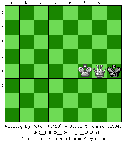 Last move : 1-0 2011 September 22 10:33:59 [Event "FICGS__CHESS__RAPID_D__000061"] [Site "FICGS"] [Date "2011.08.02"] [Round "1"] [White "Willoughby,Peter"] [Black "Joubert,Hennie"] [Result "1-0"] [WhiteElo "1420"] [BlackElo "1384"] 1.d4 Nf6 2.Nf3 g6 3.c4 Bg7 4.Nc3 O-O 5.e4 d6 6.Bd3 e5 7.dxe5 dxe5 8.O-O Nc6 9.Rb1 Qe7 10.a3 Rd8 11.Qc2 Bg4 12.Nd2 Nd4 13.Qa4 Rd6 14.f3 Bd7 15.Qd1 Bc6 16.a4 Rad8 17.Nd5 Qe6 18.Nxc7 Qc8 19.Nd5 Kh8 20.Ne7 Qc7 21.Nd5 Qc8 22.b4 Bxd5 23.exd5 a6 24.Ne4 R6d7 25.Bg5 Nxe4 26.fxe4 Rf8 27.Be3 Qd8 28.c5 f5 29.d6 f4 30.Bf2 b6 31.Bxa6 bxc5 32.bxc5 Qa5 33.Bb5 R7d8 34.d7 Nxb5 35.Rxb5 Qc7 36.Rb6 Rxd7 37.Rd6 Rfd8 38.Rxd7 Rxd7 39.Qc2 Qc6 40.Rc1 Ra7 41.Ra1 Bf8 42.Kf1 Ra5 43.Qc3 Qc7 44.Ke2 Be7 45.c6 Ra6 46.Rc1 Rxa4 47.Qc2 Ra6 48.g3 g5 49.gxf4 gxf4 50.Qc4 Ra5 51.Rb1 Ra8 52.Rb7 Qd6 53.Qf7 Rd8 54.Rd7 Rxd7 55.Qe8+ Kg7 56.cxd7 Qa6+ 57.Kf3 Qd3+ 58.Kg2 Bf6 59.Qe6 Qxe4+ 60.Kf1 Qd3+ 61.Kg2 Qg6+ 62.Kf3 Qd3+ 63.Kg2 f3+ 64.Kg3 e4 65.Qg4+ Kf8 66.Bc5+ Kf7 67.Qh5+ Ke6 68.Qe8+ Kd5 69.Bf2 Be5+ 70.Kg4 Bc7 71.d8Q+ Bxd8 72.Qxd8+ Kc4 73.Qc7+ Kb3 74.Qxh7 Kc2 75.Qa7 Qc4 76.Qc5 Qxc5 77.Bxc5 Kd2 78.Kf4 Ke2 79.Kxe4 f2 80.Bxf2 Kxf2 81.h4 Kg3 82.h5 Kg4 83.h6 Kg5 84.h7 Kg6 85.h8Q Kg5 86.Qe5+ Kg4 87.Qg7+ Kh5 88.Kf4 Kh4 89.Qg4+ 1-0 King's Indian : East Indian defense Kingside Castling by player Black (move 4) Kingside Castling by player White (move 8) Promotion Queen by player White (move 71) 10 pieces endgame at move 71 : White KQBP , Black KQBPPP WHITE : King + 1 Queen 1 Bishop 1 Pawn BLACK : King + 1 Queen 1 Bishop 3 Pawns 9 pieces endgame at move 72 : White KQBP , Black KQPPP WHITE : King + 1 Queen 1 Bishop 1 Pawn BLACK : King + 1 Queen 3 Pawns 8 pieces endgame at move 74 : White KQBP , Black KQPP WHITE : King + 1 Queen 1 Bishop 1 Pawn BLACK : King + 1 Queen 2 Pawns 7 pieces endgame at move 76 : White KBP , Black KQPP WHITE : King + 1 Bishop 1 Pawn BLACK : King + 1 Queen 2 Pawns 6 pieces endgame at move 77 : White KBP , Black KPP WHITE : King + 1 Bishop 1 Pawn BLACK : King + 2 Pawns 5 pieces endgame at move 79 : White KBP , Black KP WHITE : King + 1 Bishop 1 Pawn BLACK : King + 1 Pawn 4 pieces endgame at move 80 : White KBP , Black K WHITE : King + 1 Bishop 1 Pawn BLACK : King + 3 pieces endgame at move 80 : White KP , Black K WHITE : King + 1 Pawn BLACK : King + Promotion Queen by player White (move 85) Player White won this chess game. Follow this game move after move (download)Everything is in a state of flux, and this includes the world of Chess. (Mikhail Botvinnik) Bobby Fischer ist kein Vorbild für die heutige Jugend. (Viktor Kortschnoi) Ciertamente el estado mental actual de Bobby Fischer es una tragedia. Uno de los mas grandes jugadores de Ajedrez del mundo -el orgullo y pena del Ajedrez Americano. (Frank Brady) Dieu déplace le joueur, et celui-ci la pièce. Quel Dieu derrière Dieu commence donc la trame ? Arturo Perez-Reverte (prix de littérature policière 1993). I don't know, I don't care, and it doesn't make any difference. (Albert Einstein)