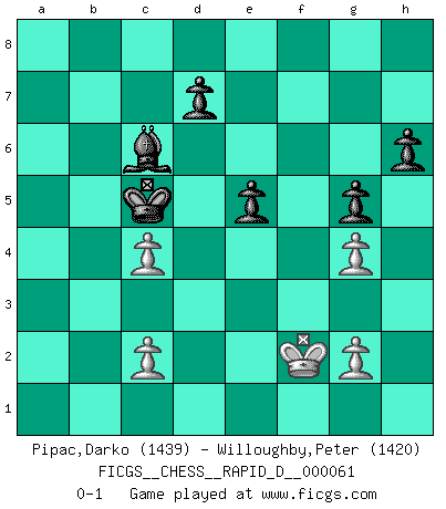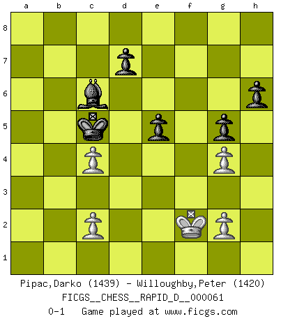 Last move : 0-1 2011 September 1 12:39:58 [Event "FICGS__CHESS__RAPID_D__000061"] [Site "FICGS"] [Date "2011.08.02"] [Round "1"] [White "Pipac,Darko"] [Black "Willoughby,Peter"] [Result "0-1"] [WhiteElo "1439"] [BlackElo "1420"] 1.e4 g6 2.d4 Bg7 3.Nc3 c5 4.Nf3 cxd4 5.Nxd4 Nc6 6.Nxc6 bxc6 7.Bc4 e6 8.O-O Ne7 9.Bg5 h6 10.Bh4 O-O 11.Re1 Re8 12.e5 Qc7 13.Qd6 Qxd6 14.exd6 Nf5 15.Bg3 Nxg3 16.hxg3 Bxc3 17.bxc3 a5 18.Rab1 Ba6 19.Re4 f5 20.Rf4 g5 21.Rd4 c5 22.Rd5 Bxc4 23.Rxc5 Bxa2 24.Ra1 Bd5 25.R1xa5 Rxa5 26.Rxa5 Rc8 27.Ra3 Kf7 28.f3 e5 29.Kf2 Ke6 30.g4 fxg4 31.fxg4 Kxd6 32.Ra6+ Rc6 33.Rxc6+ Bxc6 34.c4 Kc5 0-1 Robatsch defense Kingside Castling by player White (move 8) Kingside Castling by player Black (move 10) Player Black won this chess game. Follow this game move after move (download)I played Chess with him and would have beaten him sometimes only he always took back his last move, and ran the game out differently. (Mark Twain) Wenn Du einsam bist, wenn Du Dich in der Welt wie ein Fremder fühlst, spiele Schach. Das wird Deinen Geist erheben und Dein Ratgeber im Kampf sein. (Aristoteles) Todo lo que importa ante el tablero de Ajedrez son buenas jugadas. (Bobby Fischer) Le thème de l'attaque double intervient d'une manière ou d'une autre dans l'immense majorité des combinaisons. (Youri Averbakh) A good aphorism is too hard for the tooth of time, and is not worn away with the centuries, although it serves as food for every speech. (Friedrich Nietzsche)