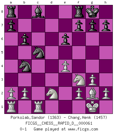 Last move : 0-1 2011 October 20 0:20:11 [Event "FICGS__CHESS__RAPID_D__000061"] [Site "FICGS"] [Date "2011.08.02"] [Round "1"] [White "Porkolab,Sandor"] [Black "Chang,Henk"] [Result "0-1"] [WhiteElo "1363"] [BlackElo "1457"] 1.d4 Nf6 2.c4 e6 3.Nf3 Bb4+ 4.Bd2 Bxd2+ 5.Nbxd2 O-O 6.Qc2 d5 7.g3 c5 8.dxc5 Nbd7 9.cxd5 Nxd5 10.Bg2 Qa5 11.O-O Qxc5 12.Qxc5 Nxc5 13.Rfc1 b6 14.e4 Nb4 0-1 This chess game has been lost on time (started : 2011.08.02 9:7:32) Bogo-Indian defense Kingside Castling by player Black (move 5) Kingside Castling by player White (move 11) Player Black won this chess game. Follow this game move after move (download)I like to say that Bobby Fischer was the greatest player ever. But what made Fischer a genius was his ability to blend an American freshness and pragmatism with Russian ideas about strategy. (Bruce Pandolfini) Vom Schach wurde gesagt das Leben sei dafür nicht lange genug. Aber das ist der Fehler des Lebens, nicht des Schach'. (Irving Chernev) Botvinnik trataba de restarle el misterio al Ajedrez, siempre relacionandolo a situaciones de la vida ordinaria. El gustaba de llamar al Ajedrez un típico problema inexacto similar a aquellos de los cuales la gente siempre tiene que enfrentarse en la vida cotidiana. (Garry Kasparov) Il s'avisa de me proposer d'apprendre les échecs qu'il jouait un peu... me voilà forcené des échecs. J'achète un échiquier, je m'enferme dans ma chambre, j'y passe des jours et des nuits à vouloir apprendre par cur toutes les parties. (Jean-Jacques Rousseau, Confessions) A mistake is only a mistake if you let it happen twice. Otherwise it is a learning experience. (Daniel Parmet)