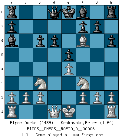 Last move : 1-0 2011 August 12 8:22:28 [Event "FICGS__CHESS__RAPID_D__000061"] [Site "FICGS"] [Date "2011.08.02"] [Round "1"] [White "Pipac,Darko"] [Black "Krakovsky,Peter"] [Result "1-0"] [WhiteElo "1439"] [BlackElo "1464"] 1.e4 c5 2.Nf3 d6 3.Bb5+ Nc6 4.Bxc6+ bxc6 5.d4 cxd4 6.Nxd4 e5 7.Nf3 Nf6 8.Nc3 Ba6 9.Bg5 h6 10.Bxf6 1-0 Sicilian : Canal-Sokolsky (Nimzovich-Rossolimo, Moscow) attack Player White won this chess game. Follow this game move after move (download)Whoever sees no other aim in the game than that of giving checkmate to one's opponent will never become a good Chess player. (Euwe) Computer sind die einzigen Gegner, die nicht immer eine Ausrede auf Lager haben, wenn sie gegen mich verlieren. (Robert James Fischer) No todos los artistas son jugadores de Ajedrez, pero todos los jugadores de Ajedrez son artistas. (Marcel Duchamp) Echiquier : carré parfait, comme la Jérusalem nouvelle décrite par l'auteur de l'Apocalypse, huit cases sur huit, exaltation du chiffre 4, symbole du cosmos aux quatre horizons... où le noir et le blanc, l'ombre et la lumière, le mal et le bien s'entremêlent et se conjuguent. (Robert Couffignal, Le Gambit du poète) Question: Is 'This statement is paradoxical' a paradoxical statement ? Or is it a meta-paradox ? (Normajean Yates)