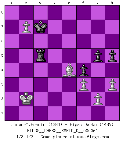 Last move : 1/2-1/2 2011 September 16 20:25:22 [Event "FICGS__CHESS__RAPID_D__000061"] [Site "FICGS"] [Date "2011.08.02"] [Round "1"] [White "Joubert,Hennie"] [Black "Pipac,Darko"] [Result "1/2-1/2"] [WhiteElo "1384"] [BlackElo "1439"] 1.e4 c5 2.Nf3 d6 3.d4 cxd4 4.Nxd4 Nf6 5.Nc3 d5 6.exd5 Nxd5 7.Nxd5 Qxd5 8.Be2 a6 9.O-O e6 10.Be3 Nc6 11.Nxc6 Qxc6 12.Bf3 Qd6 13.Qe2 g6 14.Rfd1 Qe5 15.Qd3 Qc7 16.Bd4 Rg8 17.Bf6 Be7 18.Bxe7 Qxe7 19.Rd2 e5 20.Rad1 Bf5 21.Qb3 Rb8 22.Bc6+ Kf8 23.Rd7 Bxd7 24.Rxd7 Qe6 25.Rxb7 Qxb3 26.Rxb3 Rxb3 27.axb3 Ke7 28.Kf1 Rc8 29.Be4 f5 30.Bd3 e4 31.Bc4 Kd6 32.Ke2 Ke5 33.c3 a5 34.Kd2 h6 35.Bf7 g5 36.Kc2 f4 37.Kd2 Rb8 38.Ke2 a4 39.b4 a3 40.bxa3 Ra8 41.c4 Rxa3 42.b5 Kd6 43.Bd5 Kc5 44.Bxe4 Kxc4 45.b6 Rb3 46.b7 Kc5 47.h3 h5 48.Kd2 Kd6 49.Kc2 Rb4 50.f3 Kc7 51.Bd5 Rb5 52.Be4 Rc5+ 53.Kb2 Rb5+ 54.Kc2 Rc5+ 55.Kb2 1/2-1/2 Sicilian Kingside Castling by player White (move 9) This chess game ended in a draw. Follow this game move after move (download)There just isn't enough televised Chess. (David Letterman) Drei Punkte vor allen anderen ist wie einer, der im weißen Anzug posiert, während der Rest in Müllsäcke gekleidet dasteht. (Viktor Kortschnoi) En un gambito tu regalas un Peón por el bién de tomar un juego perdido. (Samuel Standige Boden) Demandez au pauvre Cg1 ce qu'il en pense. Eduard Gufeld à propos de la variante Saemisch de l'Est-Indienne. I couldn't make any sense out of what this particular thread is about. It sounds like R2 D2 computer speaking. A space fight ?!? Some 'command' problems in Moscow ? Some killers & narcotic addicts attacking some game & a god wannabe ?? (Dinesh De Silva, lost in a russian conflict in FICGS forum)