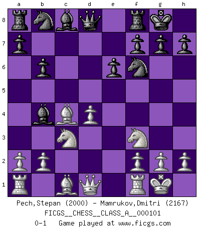 Last move : 0-1 2011 October 8 23:39:54 [Event "FICGS__CHESS__CLASS_A__000101"] [Site "FICGS"] [Date "2011.08.03"] [Round "1"] [White "Pech,Stepan"] [Black "Mamrukov,Dmitri"] [Result "0-1"] [WhiteElo "2000"] [BlackElo "2167"] 1.d4 Nf6 2.c4 e6 3.Nc3 Bb4 4.e3 c5 5.Bd3 O-O 6.Nf3 d5 7.O-O dxc4 8.Bxc4 cxd4 9.exd4 b6 0-1 This chess game has been lost on time (started : 2011.08.03 23:9:41) Nimzo-Indian : 4.e3 c5 Kingside Castling by player Black (move 5) Kingside Castling by player White (move 7) Player Black won this chess game. Follow this game move after move (download)Some sacrifices are sound; the rest are mine. (Mikhail Tal) Ein unbeabsichtigtes Patt ist der Gipfel der Dummheit. (Anonymous) Un buen jugador siempre tiene buena suerte. (José Raúl Capablanca) Les ravages du H expliquent la différence de niveau entre Tal et Thal [Abergel]. Art is not a thing, it is a way. (Elbert Hubbard)