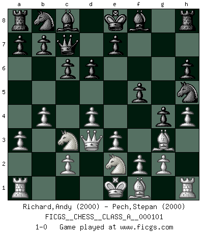Last move : 1-0 2011 December 1 21:57:41 [Event "FICGS__CHESS__CLASS_A__000101"] [Site "FICGS"] [Date "2011.08.03"] [Round "1"] [White "Richard,Andy"] [Black "Pech,Stepan"] [Result "1-0"] [WhiteElo "2000"] [BlackElo "2000"] 1.d4 f5 2.Bg5 h6 3.Bh4 g5 4.e3 Nf6 5.Bg3 d6 6.h4 g4 7.Ne2 c6 8.Nbc3 Qb6 9.b3 Qa5 10.a3 Nh5 11.b4 Qc7 12.Qd3 1-0 Dutch, 2.Bg5 variation Player White won this chess game. Follow this game move after move (download)A bad day of Chess is better than any good day at work. (Anonymous) Jeder Fehler erscheint unglaublich dumm, wenn andre ihn begehen. (Georg Christoph Lichtenberg) El Ajedrez es tan inspirador que yo no creo que un buen jugador sea capaz de tener un pensamiento malo durante una partida. (Wilhelm Steinitz) La guerre est enfant de la passion, la passion est enfant du narcissisme et le narcissisme est l'enfant. (...) Une autre partie ? (Thibault de Vassal) Waiting for chance ? Play in casinos. (FICGS proverb)