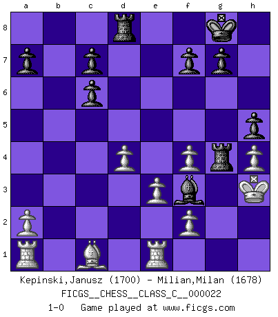 Last move : 1-0 2007 May 24 4:57:7 [Event "FICGS__CHESS__CLASS_C__000022"] [Site "FICGS"] [Date "2006.12.29"] [Round "1"] [White "Kepinski,Janusz"] [Black "Milian,Milan"] [Result "1-0"] [WhiteElo "1700"] [BlackElo "1678"] 1.c4 d5 2.cxd5 Nf6 3.Nc3 Nxd5 4.g3 Nxc3 5.bxc3 e5 6.Bg2 Bc5 7.e3 O-O 8.d4 exd4 9.cxd4 Bd6 10.Ne2 Nc6 11.O-O h5 12.Bxc6 bxc6 13.Nf4 Bxf4 14.gxf4 Bg4 15.Qc2 Bf3 16.Qf5 Re8 17.Qg5 Re6 18.Qxd8+ Rxd8 19.h4 Rg6+ 20.Kh2 Rg2+ 21.Kh3 Rg4 22.Re1 1-0 English Opening Kingside Castling by player Black (move 7) Kingside Castling by player White (move 11) Player White won this chess game. Follow this game move after move (download)Chess is a beautiful mistress. (Bent Larsen) Man gibt nur Pakete auf. (Paul Keres) Una buena ofensiva y una buena defensa, comienzan ambas con un buen desarrollo. (Bruce A. Moon) Mon pion favori sur ma case favorite ! Bronstein en parlant d'un coup de pion en h5 quand il avait les Noirs. Information on the Internet is subject to the same rules and regulations as conversation at a bar. (George Lundberg)