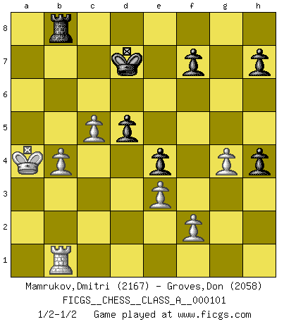Last move : 1/2-1/2 2011 August 16 10:36:58 [Event "FICGS__CHESS__CLASS_A__000101"] [Site "FICGS"] [Date "2011.08.03"] [Round "1"] [White "Mamrukov,Dmitri"] [Black "Groves,Don"] [Result "1/2-1/2"] [WhiteElo "2167"] [BlackElo "2058"] 1.d4 d5 2.c4 c6 3.Nf3 Nf6 4.e3 Bg4 5.Qb3 Qb6 6.Nc3 e6 7.Nh4 Bh5 8.h3 Qxb3 9.axb3 Na6 10.g4 Nb4 11.Ke2 g5 12.gxh5 gxh4 13.Bg2 Nxh5 14.Bd2 Kd7 15.Ra4 a5 16.c5 Be7 17.Rha1 Nc2 18.Rc1 Nb4 19.Bf3 Nf6 20.Na2 b6 21.Nxb4 axb4 22.Bxb4 bxc5 23.dxc5 Rhb8 24.Bc3 Ne8 25.Rxa8 Rxa8 26.b4 Bf6 27.Kd3 Bxc3 28.Kxc3 Nf6 29.Rd1 Ke7 30.Re1 e5 31.b5 cxb5 32.Kb4 Ra2 33.Rb1 Ra8 34.Kxb5 Rb8+ 35.Ka5 e4 36.Bg4 Nxg4 37.hxg4 Kd7 38.b4 Ra8+ 39.Kb5 Rb8+ 40.Ka4 1/2-1/2 QGD Slav : 4.e3 This chess game ended in a draw. Follow this game move after move (download)The laws of Chess do not permit a free choice: you have to move whether you like it or not. (Emanuel Lasker) Karpov ist ein Museumsstück. (Garry Kasparov) El ganador de una partida es aquel jugador que hace el penúltimo error. (Savielly Tartakover) Les sacrifices démontrent seulement que quelqu'un a gaffé. (Savielly Tartacover) When the going gets tactical, the computers get going. (Hyatt)