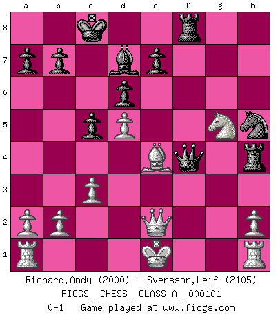 Last move : 0-1 2011 August 23 11:50:25 [Event "FICGS__CHESS__CLASS_A__000101"] [Site "FICGS"] [Date "2011.08.03"] [Round "1"] [White "Richard,Andy"] [Black "Svensson,Leif"] [Result "0-1"] [WhiteElo "2000"] [BlackElo "2105"] 1.d4 Nf6 2.Bg5 c5 3.Bxf6 gxf6 4.d5 Qb6 5.Qc1 f5 6.c3 d6 7.g3 Nd7 8.Bg2 Nf6 9.Nd2 Bd7 10.Nh3 h5 11.Qc2 Qa6 12.Nf4 h4 13.e4 hxg3 14.fxg3 Bh6 15.exf5 Bxf4 16.gxf4 Rh4 17.Ne4 O-O-O 18.Qf2 Rdh8 19.Ng5 Qd3 20.Qe2 Qxf5 21.Nxf7 Rf8 22.Ng5 Nh5 23.Be4 Qxf4 0-1 Trompowsky attack (Ruth, Opovcensky Opening) Queenside Castling by player Black (move 17) Player Black won this chess game. Follow this game move after move (download)When you don't know what to do, wait for your opponent to get an idea - it's sure to be wrong. (Tarrasch) Um dein Spiel zu verbessern musst du zuallererst das Endspiel studieren, denn diese kann unabhängig studiert werden. Die Eröffnung und das Mittelspiel müssen immer in Bezug gesetzt werden zum Endspiel. (José Raúl Capablanca) La última cosa en que Fischer estaba interesado era en tonterías, siempre y cuando el Ajedrez estuviera involucrado. (Elie Agur) Karpov est une pièce de musée. (Garry Kasparov) Go and wake up your luck. (Persian saying)