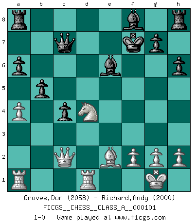 Last move : 1-0 2011 August 7 0:59:28 [Event "FICGS__CHESS__CLASS_A__000101"] [Site "FICGS"] [Date "2011.08.03"] [Round "1"] [White "Groves,Don"] [Black "Richard,Andy"] [Result "1-0"] [WhiteElo "2058"] [BlackElo "2000"] 1.e4 e6 2.d4 d5 3.Nc3 h6 4.Bd3 Nc6 5.Nf3 Nb4 6.Bb5+ c6 7.Be2 Nf6 8.e5 Ne4 9.a3 Nxc3 10.bxc3 Na6 11.O-O c5 12.c4 Nc7 13.cxd5 exd5 14.c4 dxc4 15.Qc2 b5 16.Rd1 Bb7 17.a4 a6 18.dxc5 Qc8 19.c6 Bxc6 20.e6 Bd5 21.exf7+ Kxf7 22.Bf4 Be6 23.Bxc7 Qxc7 24.Nd4 1-0 French : Paulsen variation Kingside Castling by player White (move 11) Player White won this chess game. Follow this game move after move (download)There are two types of sacrifices: correct ones and mine. (Mikhail Tal) Gewöhnliche Menschen denken nur daran, wie sie ihre Zeit verbringen. Ein intelligenter Mensch versucht, sie auszunutzen. (Arthur Schopenhauer) En el Ajedrez, tal como es jugado por los Maestros, practicamente la suerte es eliminada. (Emanuel Lasker) Je menace de comprendre la position. (Anonyme) Perhaps the current trend of many chess professionals taking up the more lucrative pastime of poker is not a wholly negative one. It may not be too late for humans to relearn how to take risks in order to innovate and thereby maintain the advanced lifestyles we enjoy. And if it takes a poker-playing supercomputer to remind us that we can't enjoy the rewards without taking the risks, so be it. (The Chess Master and the Computer, by Garry Kasparov - 2010)